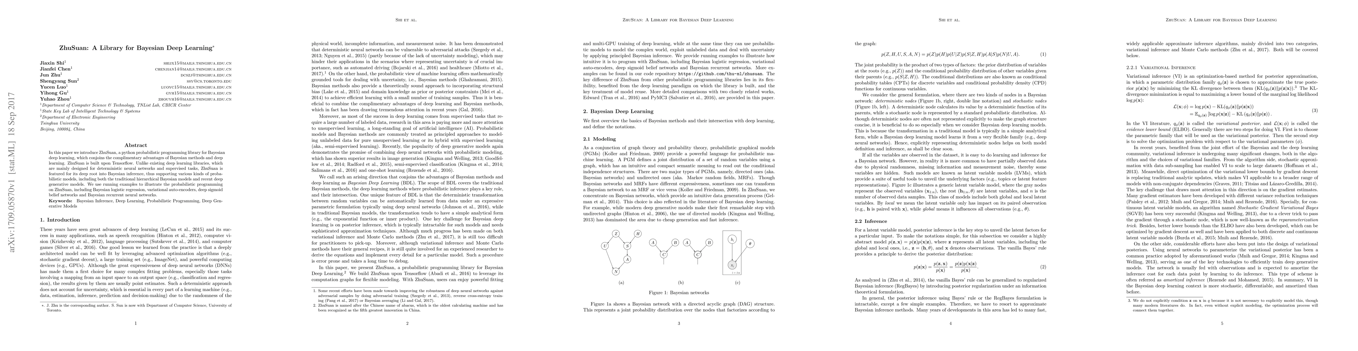 ZhuSuan is a Python probabilistic programming library for Bayesian deep learning that integrates the strengths of Bayesian methods and deep learning, supporting various probabilistic models and running examples like Bayesian logistic regression and variational auto-encoders. It leverages Tensorflow and focuses on Bayesian inference for both traditional and deep generative models.