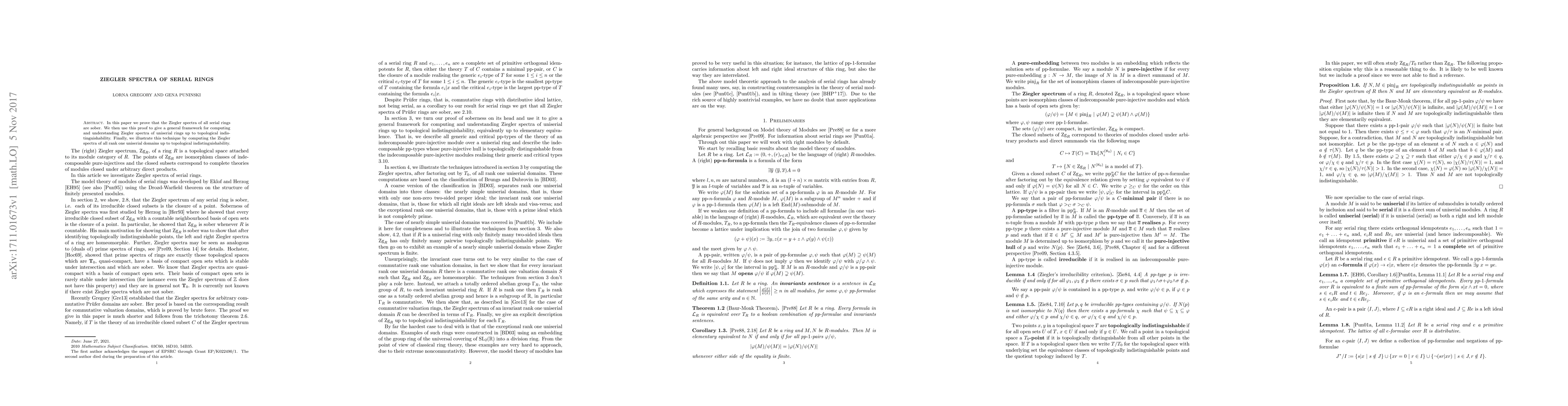 In this paper we prove that the Ziegler spectra of all serial rings are sober. We then use this proof to give a general framework for computing and understanding Ziegler spectra of uniserial rings up to topological indistinguishability. Finally, we illustrate this technique by computing the Ziegler spectra of all rank one uniserial domains up to topological indistinguishability.
