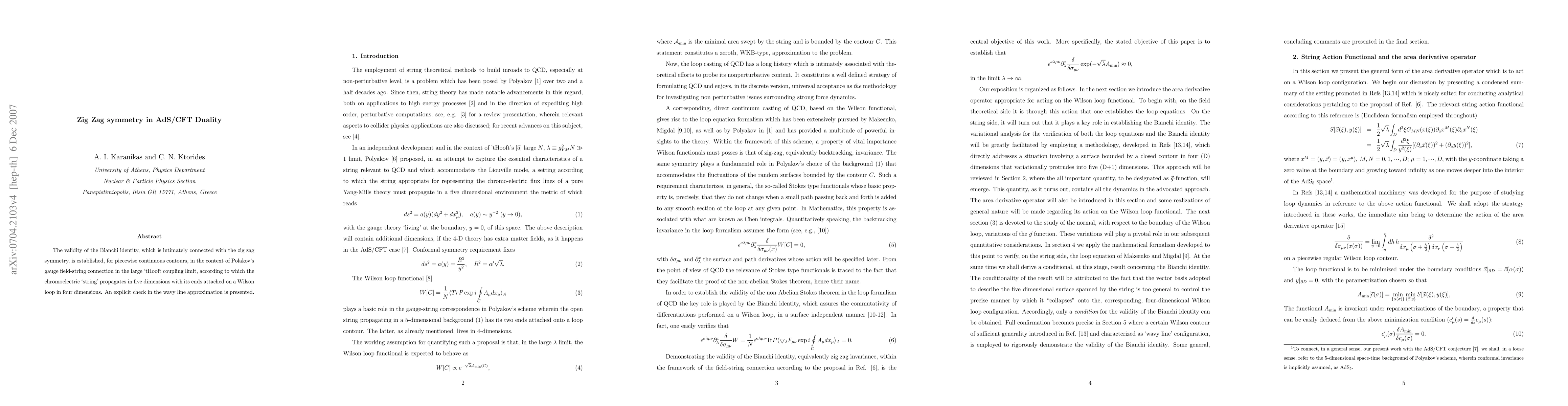 The validity of the Bianchi identity, which is intimately connected with the zig zag symmetry, is established, for piecewise continuous contours, in the context of Polakov's gauge field-string connection in the large 'tHooft coupling limit, according to which the chromoelectric `string' propagates in five dimensions with its ends attached on a Wilson loop in four dimensions. An explicit check in the wavy line approximation is presented.