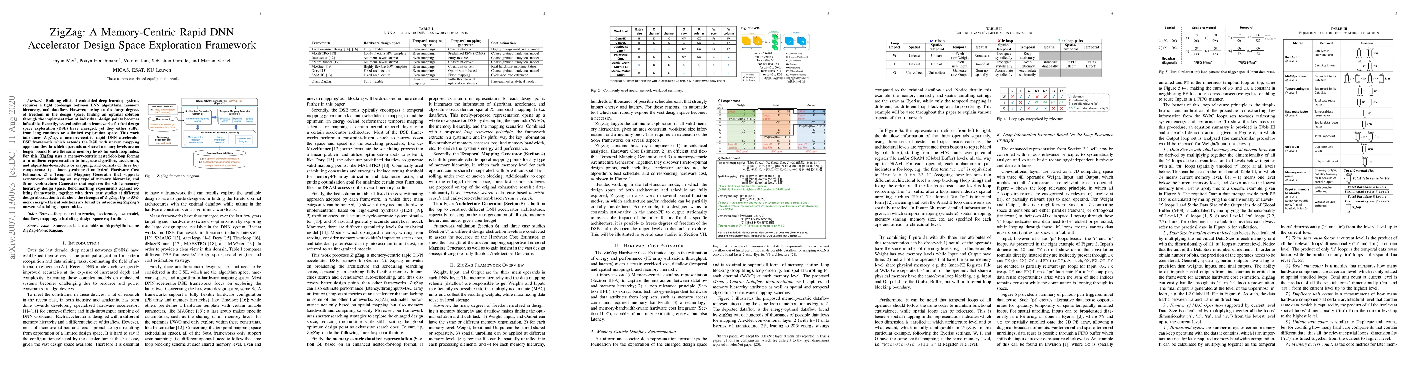 ZigZag is a memory-centric framework for rapid DNN accelerator design space exploration, featuring a latency-enhanced analytical estimator, a temporal mapping generator for uneven scheduling, and an architecture generator for exploring the entire memory hierarchy. It finds up to 33% more energy-efficient solutions compared to existing frameworks.