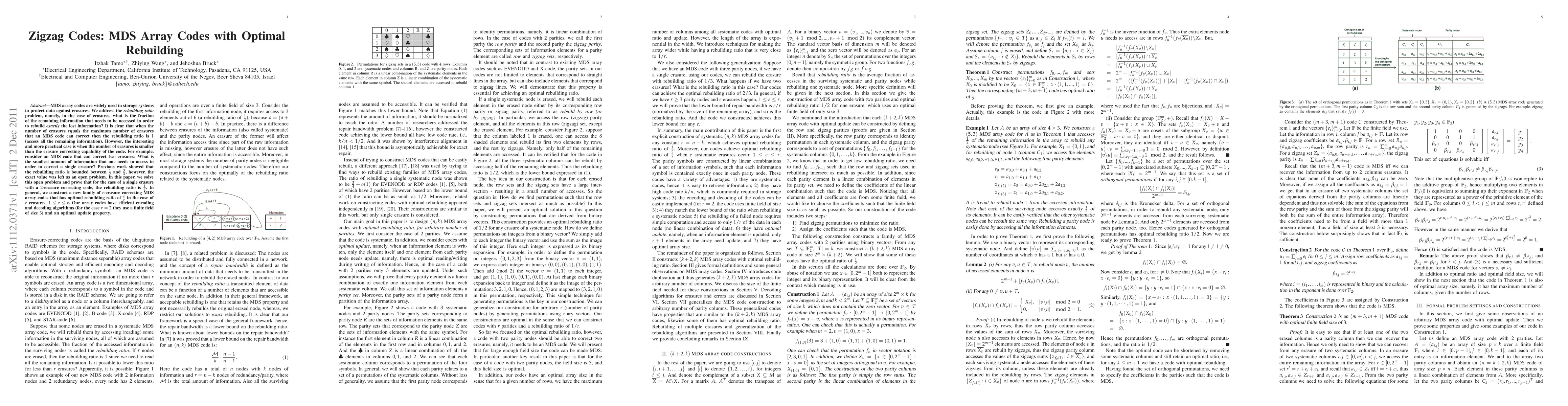This paper introduces a new family of Zigzag MDS array codes that optimize the rebuilding ratio for data erasures, proving that for a single erasure in a 2-erasure correcting code, the rebuilding ratio is exactly 1/2. The proposed codes achieve an optimal rebuilding ratio of $\frac{e}{r}$ for $e$ erasures, where $1 \le e \le r$, and feature efficient encoding and decoding algorithms.