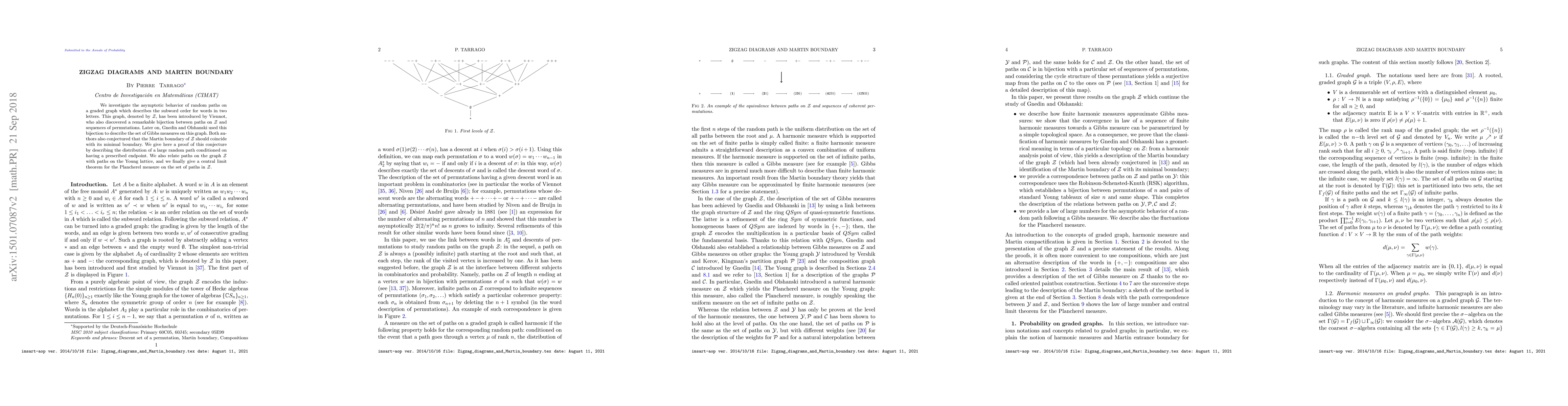 This paper proves the conjecture that the Martin boundary of the graded graph $\mathcal{Z}$ coincides with its minimal boundary by analyzing the asymptotic behavior of random paths and their conditioned distributions. It also establishes a connection between paths on $\mathcal{Z}$ and the Young lattice, and provides a central limit theorem for the Plancherel measure on paths in $\mathcal{Z}$.