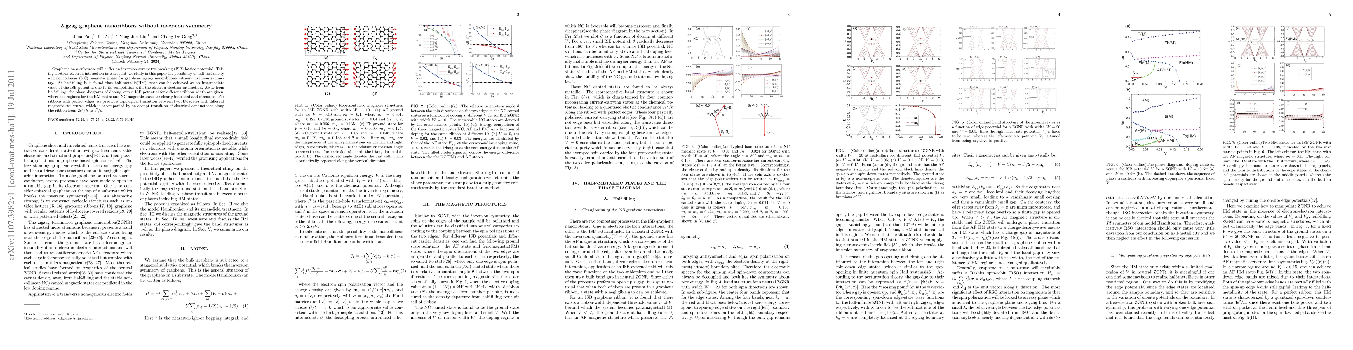 Researchers study graphene nanoribbons without inversion symmetry, finding conditions for half-metallicity and noncollinear magnetic phases, with potential applications in electronics.