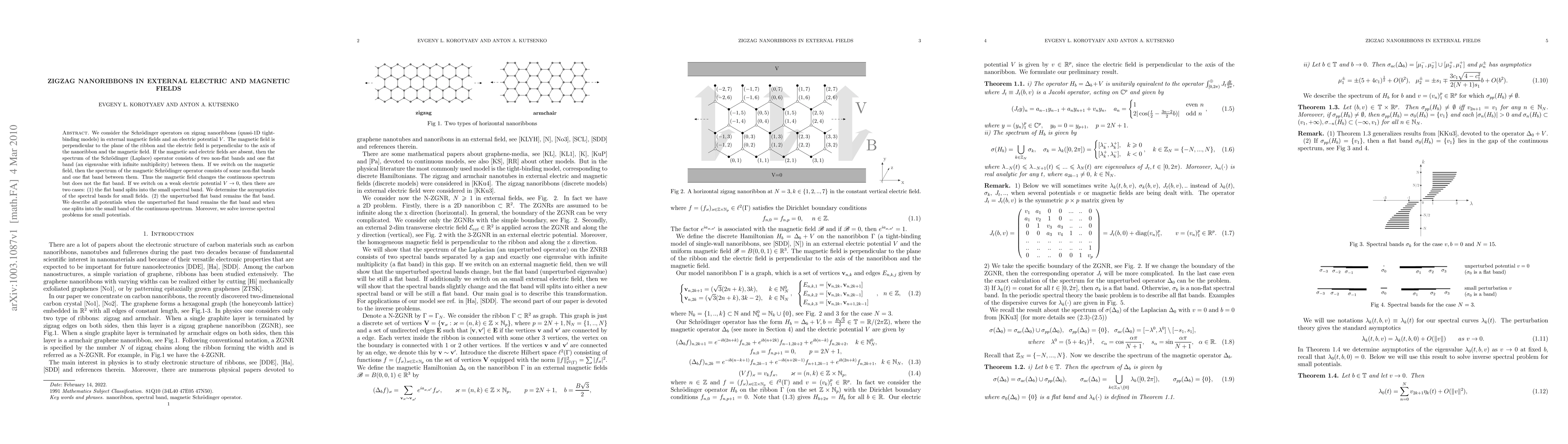 The research investigates zigzag nanoribbons under external electric and magnetic fields using Schrödinger operators in tight-binding models. The study examines spectral properties under varying field conditions.