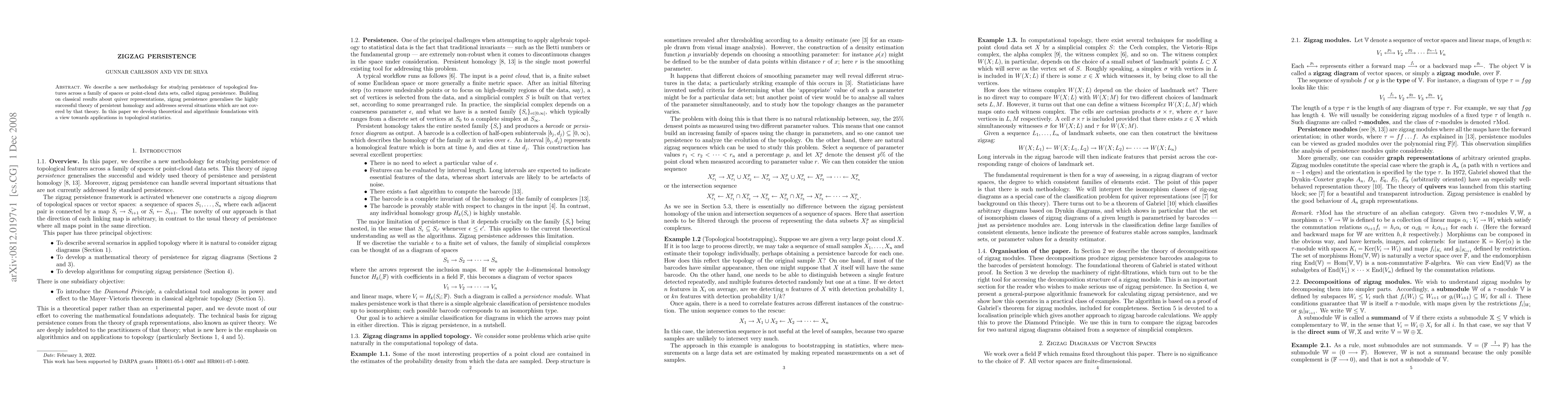 Summary: Zigzag persistence is a novel methodology for analyzing topological features across varying spaces or datasets, extending persistent homology theory. The approach utilizes quiver representations and aims to enhance applications in topological statistics.