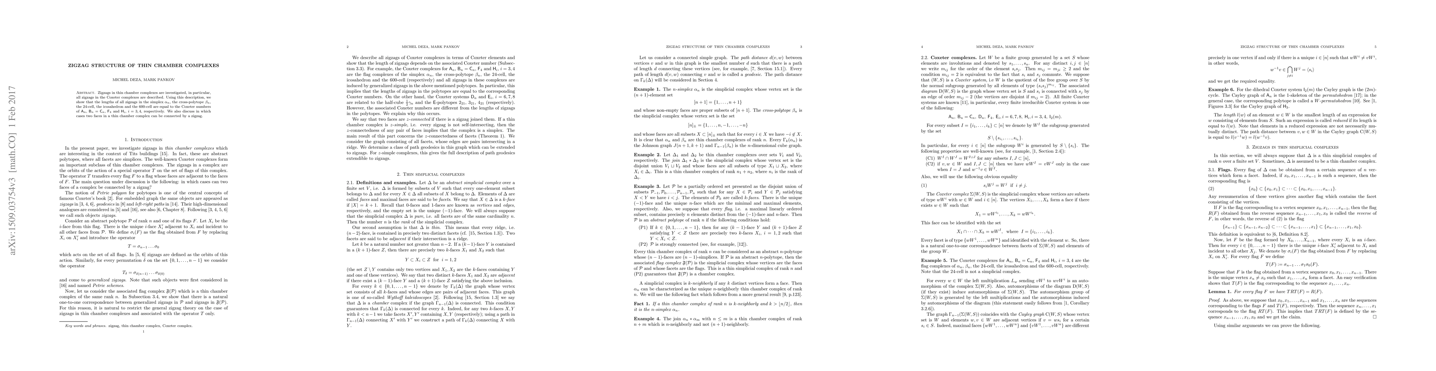 This paper investigates zigzag structures in thin chamber complexes, particularly focusing on Coxeter complexes and demonstrating that the lengths of generalized zigzags in various geometric shapes match their respective Coxeter numbers. It also explores conditions under which two faces in a thin chamber complex can be connected by a zigzag.