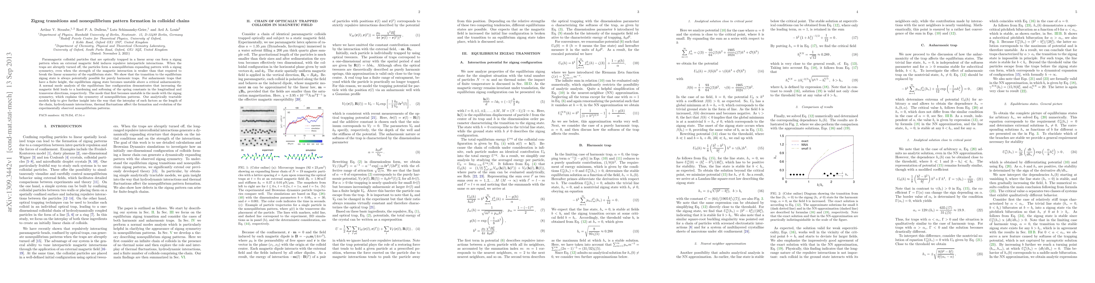 Paramagnetic colloidal particles that are optically trapped in a linear array can form a zigzag pattern when an external magnetic field induces repulsive interparticle interactions. When the traps are abruptly turned off, the particles form a nonequilibrium expanding pattern with a zigzag symmetry, even when the strength of the magnetic interaction is weaker than that required to break the linear symmetry of the equilibrium state. We show that the transition to the equilibrium zigzag state is always potentially possible for purely harmonic traps. For anharmonic traps that have a finite height, the equilibrium zigzag state becomes unstable above a critical anharmonicity. A normal mode analysis of the equilibrium line configuration demonstrates that increasing the magnetic field leads to a hardening and softening of the spring constants in the longitudinal and transverse directions, respectively. The mode that first becomes unstable is the mode with the zigzag symmetry, which explains the symmetry of nonequilibrium patterns. Our analytically tractable models help to give further insight into the way that the interplay of such factors as the length of the chain, hydrodynamic interactions, thermal fluctuations affect the formation and evolution of the experimentally observed nonequilibrium patterns.
