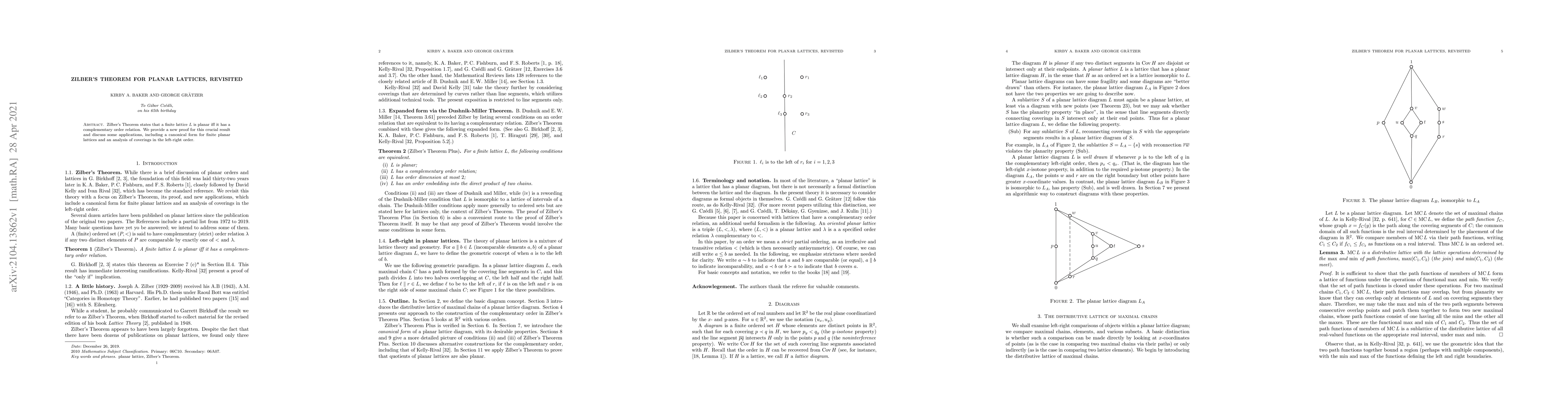 Zilber's Theorem is revisited with a new proof showing that a finite lattice is planar if and only if it has a complementary order relation. The paper also explores applications such as a canonical form for finite planar lattices and an analysis of coverings in the left-right order.