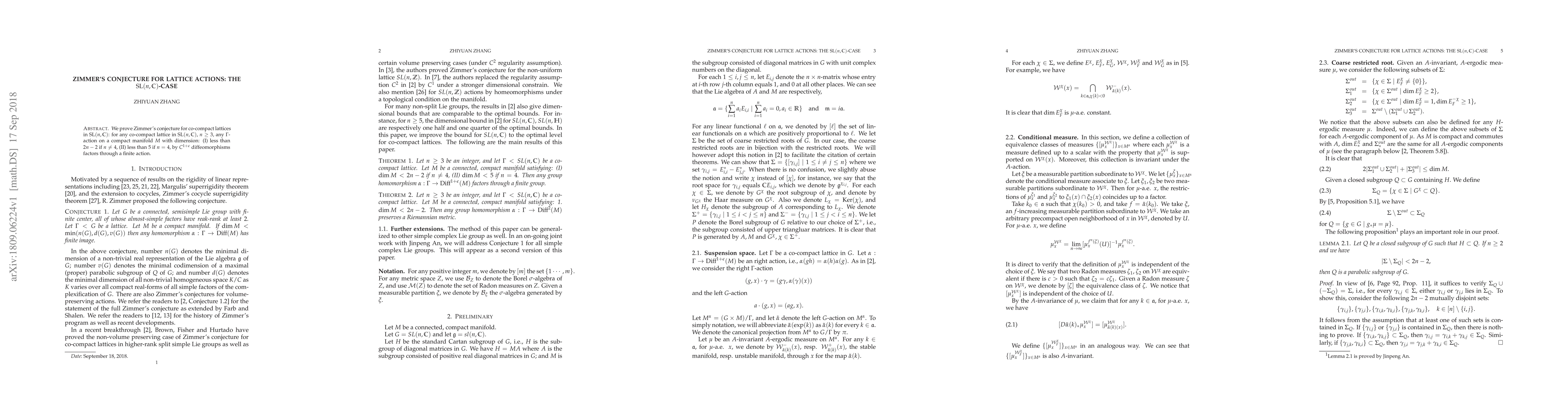 Summary: This paper proves Zimmer's conjecture for co-compact lattices in ${\rm SL}(n, \mathbb{C})$, showing that any $\Gamma$-action on a compact manifold with dimension less than $2n-2$ for $n \neq 4$ or less than $5$ for $n = 4$, by $C^{1+\epsilon}$ diffeomorphisms, factors through a finite action.
