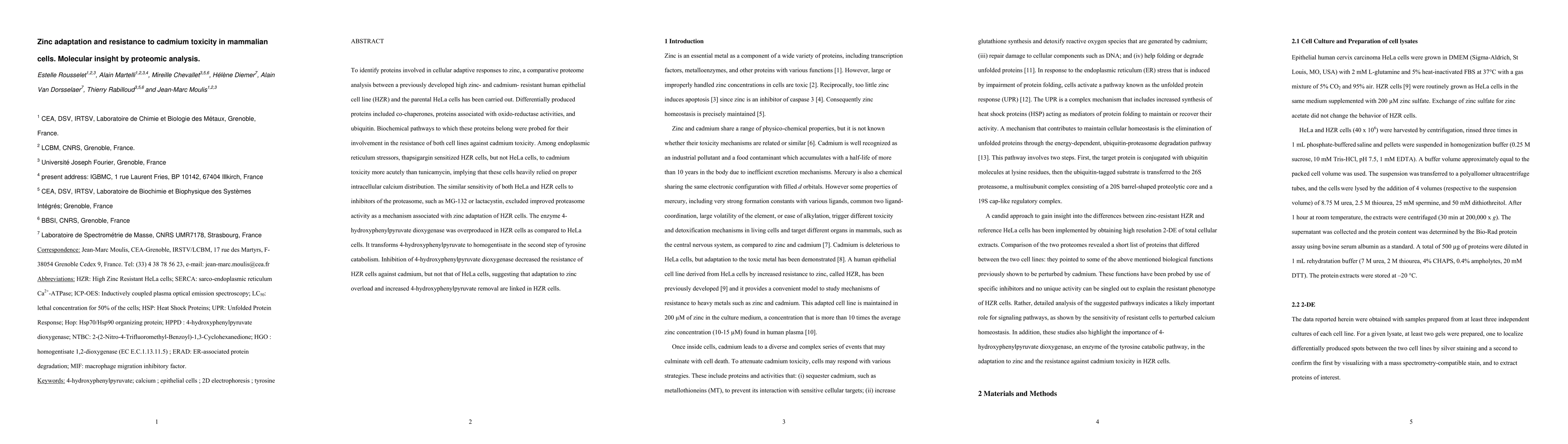 To identify proteins involved in cellular adaptive responses to zinc, a comparative proteome analysis between a previously developed high zinc- and cadmium- resistant human epithelial cell line (HZR) and the parental HeLa cells has been carried out. Differentially produced proteins included co-chaperones, proteins associated with oxido-reductase activities, and ubiquitin. Biochemical pathways to which these proteins belong were probed for their involvement in the resistance of both cell lines against cadmium toxicity. Among endoplasmic reticulum stressors, thapsigargin sensitized HZR cells, but not HeLa cells, to cadmium toxicity more acutely than tunicamycin, implying that these cells heavily relied on proper intracellular calcium distribution. The similar sensitivity of both HeLa and HZR cells to inhibitors of the proteasome, such as MG-132 or lactacystin, excluded improved proteasome activity as a mechanism associated with zinc adaptation of HZR cells. The enzyme 4-hydroxyphenylpyruvate dioxygenase was overproduced in HZR cells as compared to HeLa cells. It transforms 4-hydroxyphenylpyruvate to homogentisate in the second step of tyrosine catabolism. Inhibition of 4-hydroxyphenylpyruvate dioxygenase decreased the resistance of HZR cells against cadmium, but not that of HeLa cells, suggesting that adaptation to zinc overload and increased 4-hydroxyphenylpyruvate removal are linked in HZR cells