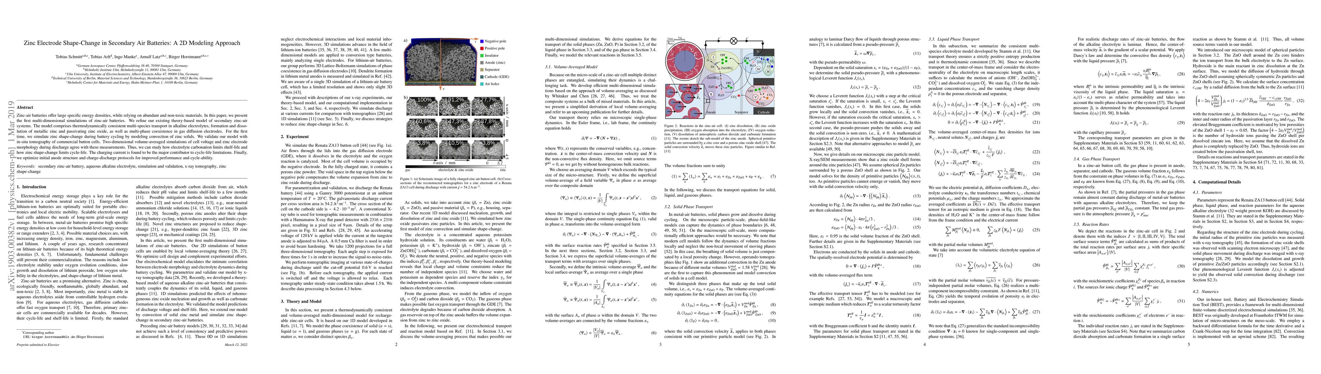 This paper presents a refined 2D model for secondary zinc-air batteries, simulating zinc shape-change and electrode morphology during discharge, validated by in-situ tomography. The study identifies charging current as the main factor limiting cycle-life and proposes optimizations for better performance.