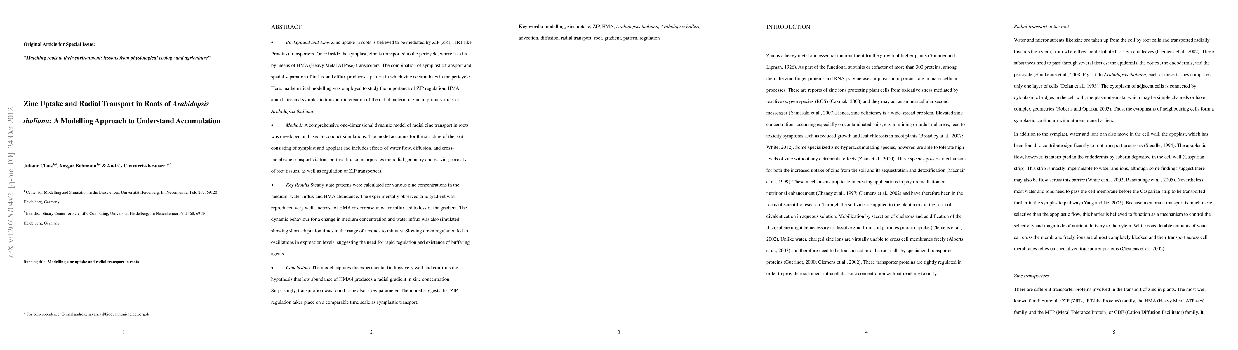 Zinc uptake in roots is believed to be mediated by ZIP (ZRT-, IRT-like Proteins) transporters. Once inside the symplast, zinc is transported to the pericycle, where it exits by means of HMA (Heavy Metal ATPase) transporters. The combination of symplastic transport and spatial separation of influx and efflux produces a pattern in which zinc accumulates in the pericycle. Here, mathematical modelling was employed to study the importance of ZIP regulation, HMA abundance and symplastic transport in creation of the radial pattern of zinc in primary roots of Arabidopsis thaliana. A comprehensive one-dimensional dynamic model of radial zinc transport in roots was developed and used to conduct simulations. The model accounts for the structure of the root consisting of symplast and apoplast and includes effects of water flow, diffusion, and cross-membrane transport via transporters. It also incorporates the radial geometry and varying porosity of root tissues, as well as regulation of ZIP transporters. Steady state patterns were calculated for various zinc concentrations in the medium, water influx and HMA abundance. The experimentally observed zinc gradient was reproduced very well. Increase of HMA or decrease in water influx led to loss of the gradient. The dynamic behaviour for a change in medium concentration and water influx was also simulated showing short adaptation times in the range of seconds to minutes. Slowing down regulation led to oscillations in expression levels, suggesting the need for rapid regulation and existence of buffering agents. The model captures the experimental findings very well and confirms the hypothesis that low abundance of HMA4 produces a radial gradient in zinc concentration. Surprisingly, transpiration was found to be also a key parameter. The model suggests that ZIP regulation takes place on a comparable time scale as symplastic transport.