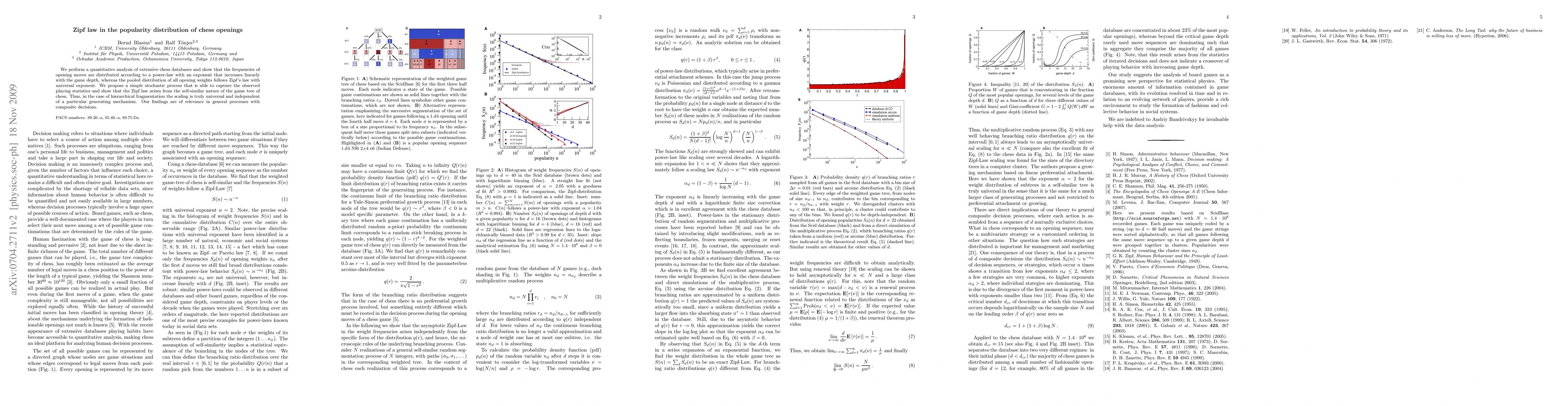 We perform a quantitative analysis of extensive chess databases and show that the frequencies of opening moves are distributed according to a power-law with an exponent that increases linearly with the game depth, whereas the pooled distribution of all opening weights follows Zipf's law with universal exponent. We propose a simple stochastic process that is able to capture the observed playing statistics and show that the Zipf law arises from the self-similar nature of the game tree of chess. Thus, in the case of hierarchical fragmentation the scaling is truly universal and independent of a particular generating mechanism. Our findings are of relevance in general processes with composite decisions.