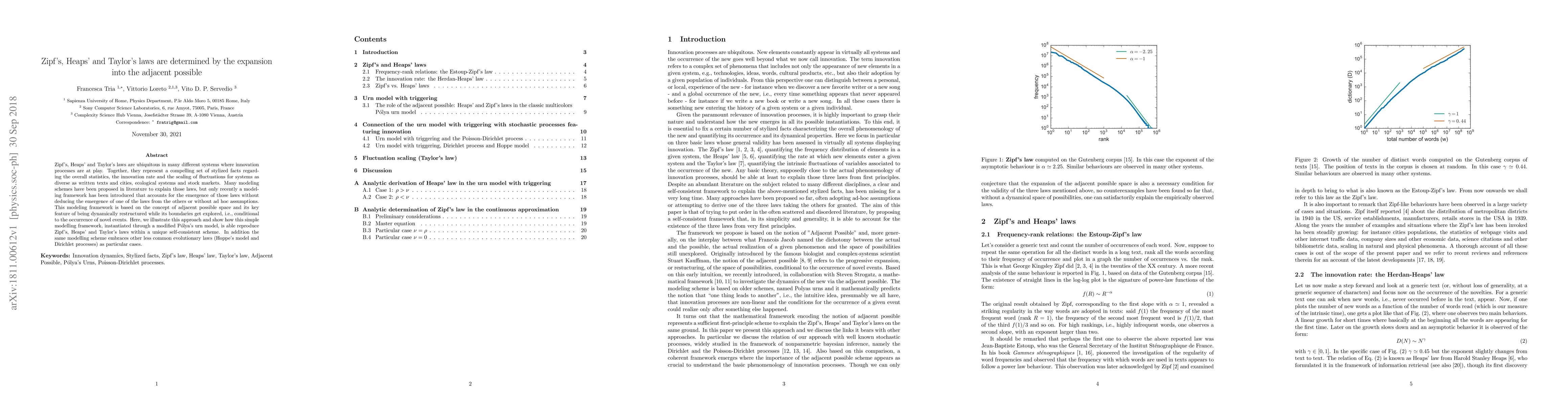 Zipf's, Heaps' and Taylor's laws are ubiquitous in many different systems where innovation processes are at play. Together, they represent a compelling set of stylized facts regarding the overall statistics, the innovation rate and the scaling of fluctuations for systems as diverse as written texts and cities, ecological systems and stock markets. Many modeling schemes have been proposed in literature to explain those laws, but only recently a modeling framework has been introduced that accounts for the emergence of those laws without deducing the emergence of one of the laws from the others or without ad hoc assumptions. This modeling framework is based on the concept of adjacent possible space and its key feature of being dynamically restructured while its boundaries get explored, i.e., conditional to the occurrence of novel events. Here, we illustrate this approach and show how this simple modelling framework, instantiated through a modified Polya's urn model, is able reproduce Zipf's, Heaps' and Taylor's laws within a unique self-consistent scheme. In addition the same modelling scheme embraces other less common evolutionary laws (Hoppe's model and Dirichlet processes) as particular cases.