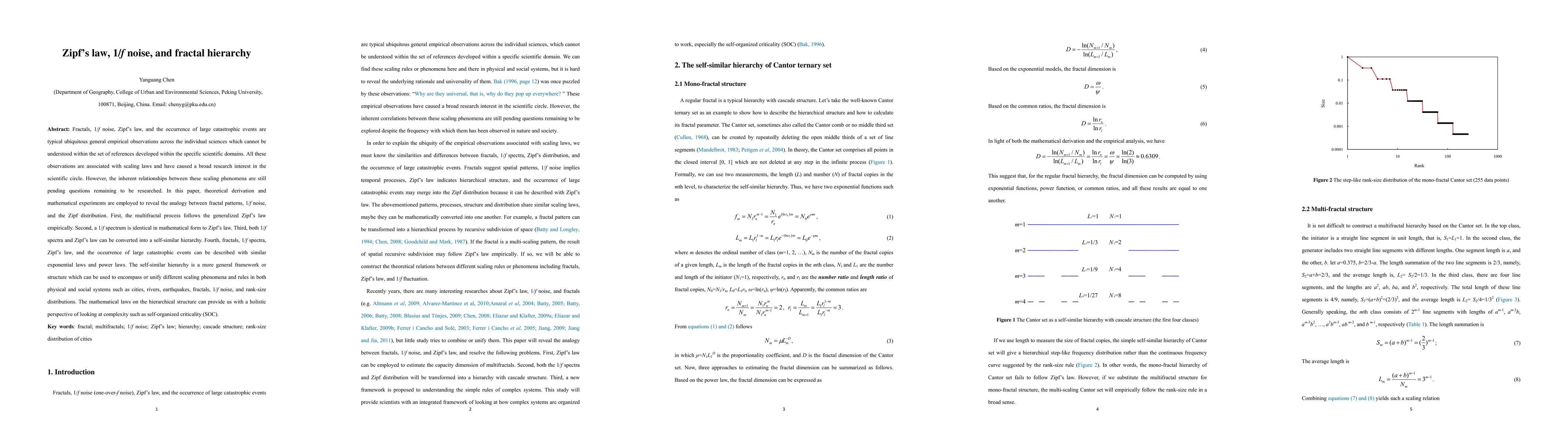 Fractals, 1/f noise, Zipf's law, and the occurrence of large catastrophic events are typical ubiquitous general empirical observations across the individual sciences which cannot be understood within the set of references developed within the specific scientific domains. All these observations are associated with scaling laws and have caused a broad research interest in the scientific circle. However, the inherent relationships between these scaling phenomena are still pending questions remaining to be researched. In this paper, theoretical derivation and mathematical experiments are employed to reveal the analogy between fractal patterns, 1/f noise, and the Zipf distribution. First, the multifractal process follows the generalized Zipf's law empirically. Second, a 1/f spectrum is identical in mathematical form to Zipf's law. Third, both 1/f spectra and Zipf's law can be converted into a self-similar hierarchy. Fourth, fractals, 1/f spectra, Zipf's law, and the occurrence of large catastrophic events can be described with similar exponential laws and power laws. The self-similar hierarchy is a more general framework or structure which can be used to encompass or unify different scaling phenomena and rules in both physical and social systems such as cities, rivers, earthquakes, fractals, 1/f noise, and rank-size distributions. The mathematical laws on the hierarchical structure can provide us with a holistic perspective of looking at complexity such as self-organized criticality (SOC).
