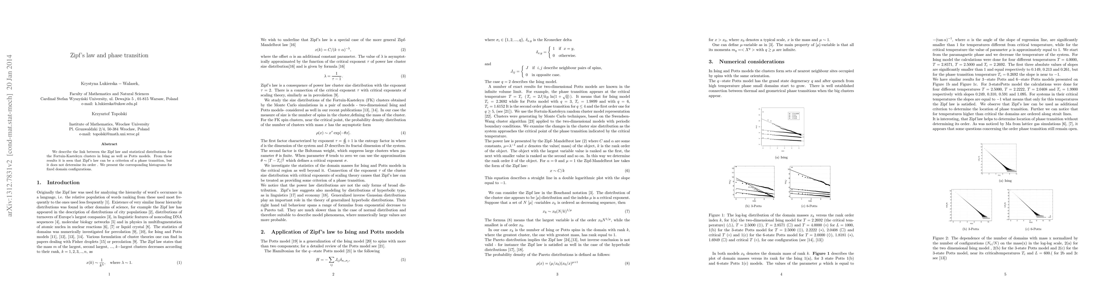 This paper explores the relationship between Zipf's law and statistical distributions in the Fortuin-Kasteleyn clusters of Ising and Potts models, demonstrating that Zipf's law can indicate a phase transition but does not specify its order. The study includes histograms for fixed domain configurations.