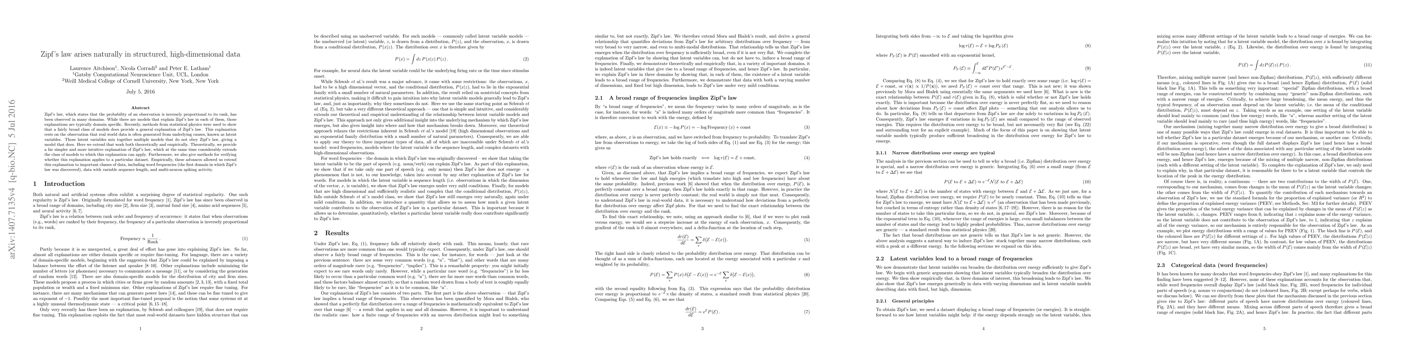 This paper provides a simpler theoretical explanation for Zipf's law, showing it arises naturally in structured, high-dimensional data through latent variables. It extends the applicability of this explanation and empirically verifies it across various data types, including word frequencies and multi-neuron activity.