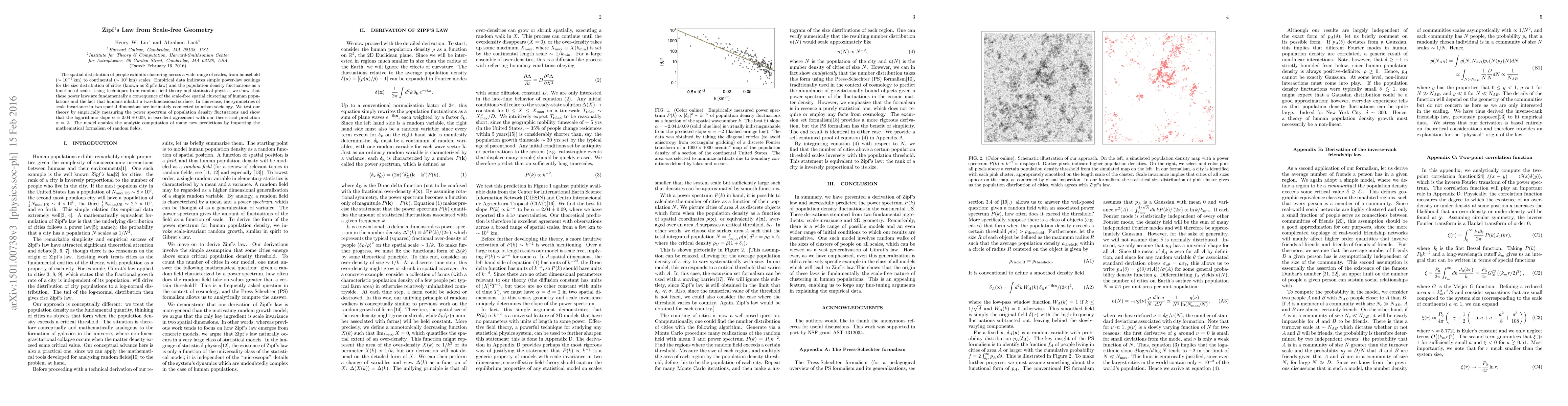 The paper introduces a novel approach to derive Zipf's law and predict the power spectrum of population density fluctuations using random field theory and statistical physics, highlighting the role of scale-free geometry in human population clustering.