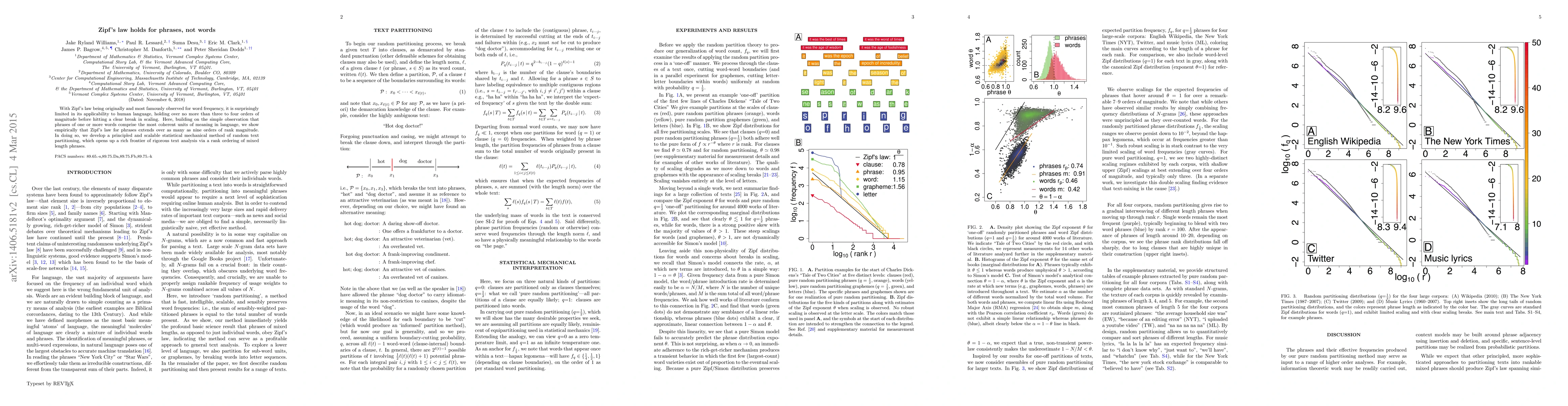 With Zipf's law being originally and most famously observed for word frequency, it is surprisingly limited in its applicability to human language, holding over no more than three to four orders of magnitude before hitting a clear break in scaling. Here, building on the simple observation that phrases of one or more words comprise the most coherent units of meaning in language, we show empirically that Zipf's law for phrases extends over as many as nine orders of rank magnitude. In doing so, we develop a principled and scalable statistical mechanical method of random text partitioning, which opens up a rich frontier of rigorous text analysis via a rank ordering of mixed length phrases.