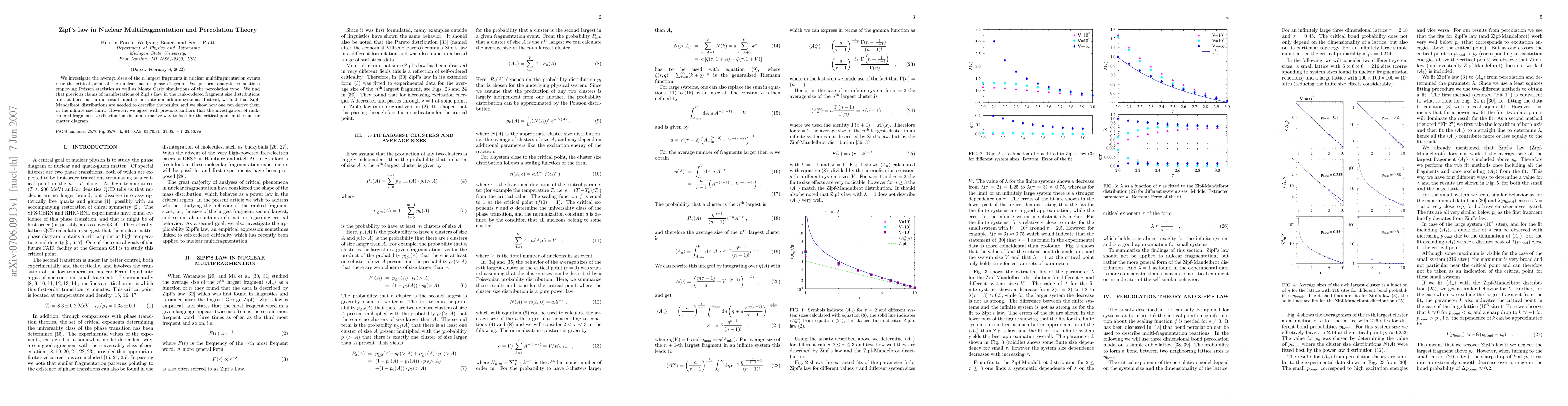 We investigate the average sizes of the $n$ largest fragments in nuclear multifragmentation events near the critical point of the nuclear matter phase diagram. We perform analytic calculations employing Poisson statistics as well as Monte Carlo simulations of the percolation type. We find that previous claims of manifestations of Zipf's Law in the rank-ordered fragment size distributions are not born out in our result, neither in finite nor infinite systems. Instead, we find that Zipf-Mandelbrot distributions are needed to describe the results, and we show how one can derive them in the infinite size limit. However, we agree with previous authors that the investigation of rank-ordered fragment size distributions is an alternative way to look for the critical point in the nuclear matter diagram.