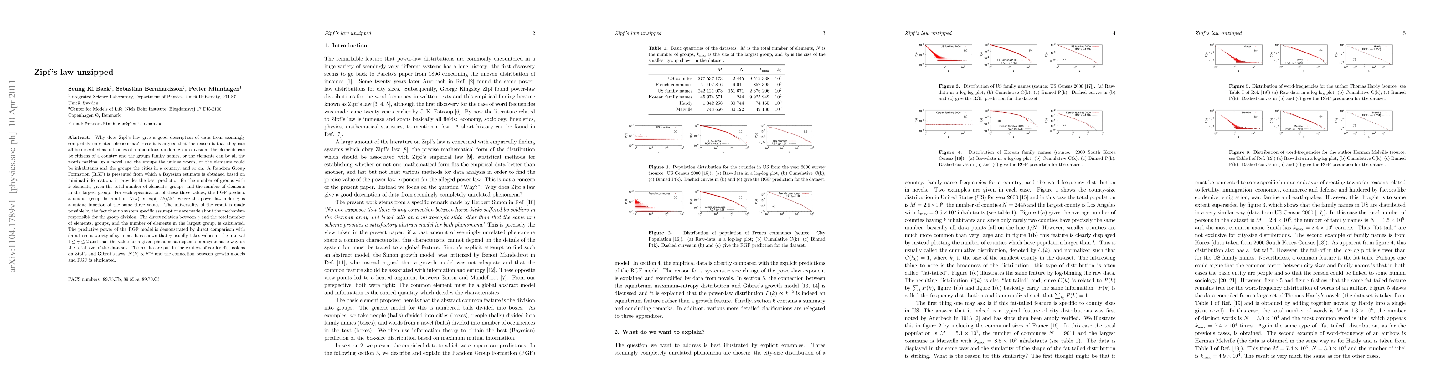 Why does Zipf's law give a good description of data from seemingly completely unrelated phenomena? Here it is argued that the reason is that they can all be described as outcomes of a ubiquitous random group division: the elements can be citizens of a country and the groups family names, or the elements can be all the words making up a novel and the groups the unique words, or the elements could be inhabitants and the groups the cities in a country, and so on. A Random Group Formation (RGF) is presented from which a Bayesian estimate is obtained based on minimal information: it provides the best prediction for the number of groups with $k$ elements, given the total number of elements, groups, and the number of elements in the largest group. For each specification of these three values, the RGF predicts a unique group distribution $N(k)\propto \exp(-bk)/k^{\gamma}$, where the power-law index $\gamma$ is a unique function of the same three values. The universality of the result is made possible by the fact that no system specific assumptions are made about the mechanism responsible for the group division. The direct relation between $\gamma$ and the total number of elements, groups, and the number of elements in the largest group, is calculated. The predictive power of the RGF model is demonstrated by direct comparison with data from a variety of systems. It is shown that $\gamma$ usually takes values in the interval $1\leq\gamma\leq 2$ and that the value for a given phenomena depends in a systematic way on the total size of the data set. The results are put in the context of earlier discussions on Zipf's and Gibrat's laws, $N(k)\propto k^{-2}$ and the connection between growth models and RGF is elucidated.