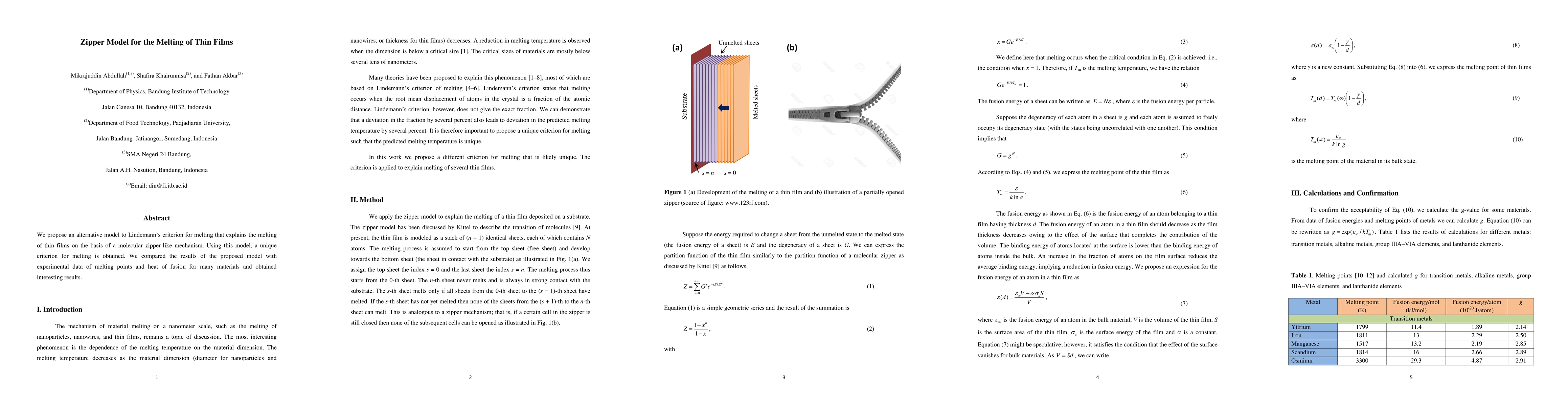 We proposed an alternative model to criterion of Lindemann for melting that explains the melting of thin films on the basis of a molecular zipper-like mechanism. Using this model, a unique criterion for melting is obtained. We compared the results of the proposed model with experimental data of melting points and heat of fusion for many materials and obtained interesting results.