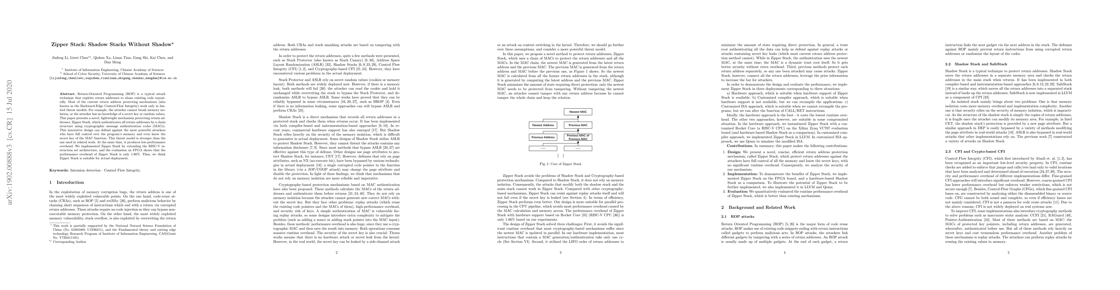 This paper introduces Zipper Stack, a lightweight mechanism that protects return addresses using cryptographic message authentication codes (MACs) in a chain structure, effectively defending against powerful attackers with full memory control and knowledge of secret keys. The implementation on RISC-V with an FPGA evaluation shows only a 1.86% performance overhead.