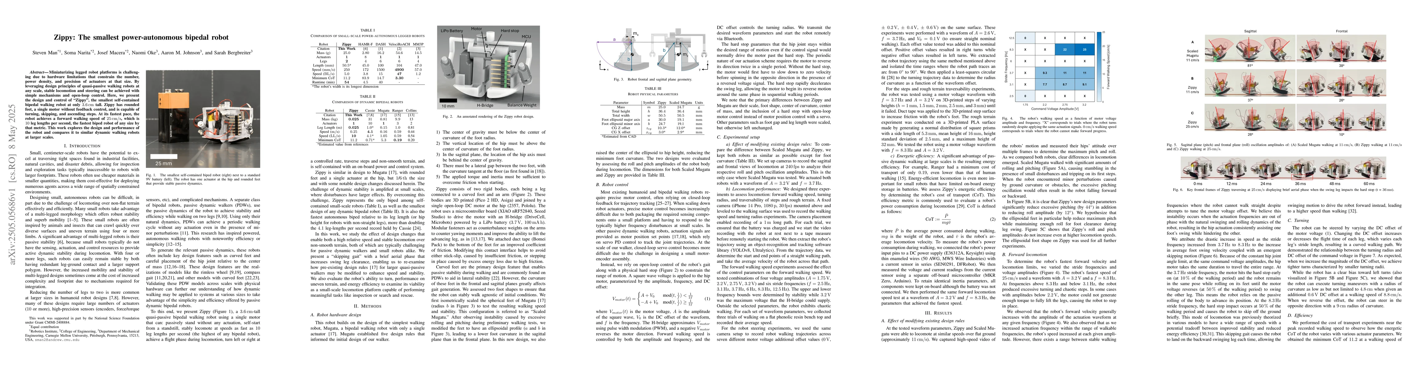 The paper presents the design and control of 'Zippy', a 3.6 cm tall bipedal walking robot, utilizing quasi-passive walking principles and simple mechanisms with open-loop control.