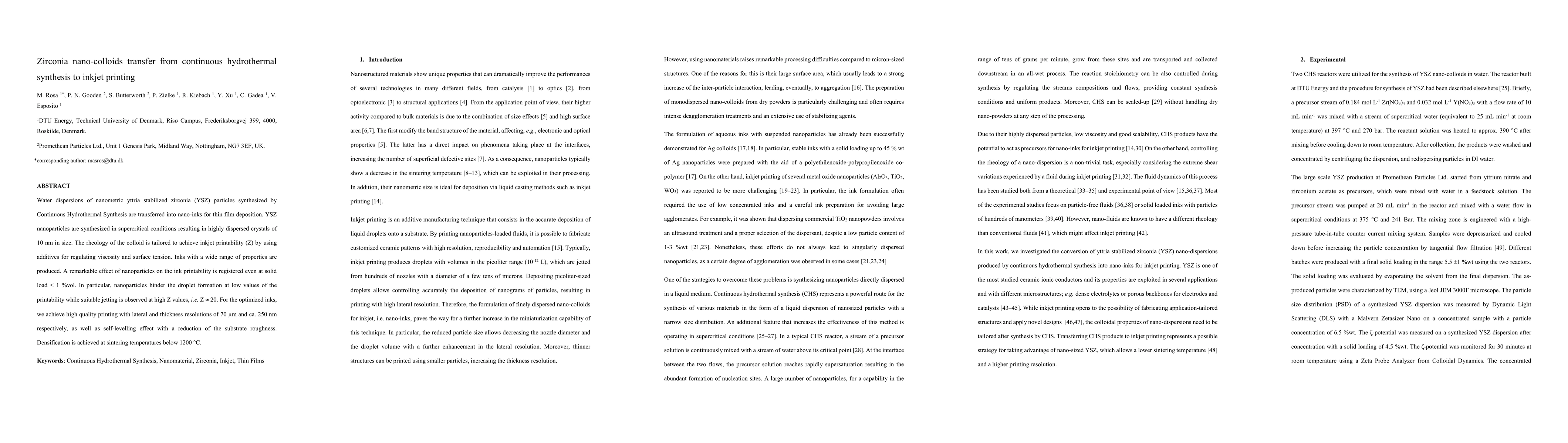 Water dispersion of nanometric yttria stabilized zirconia (YSZ) particles synthesized by continuous hydrothermal synthesis are transferred into nanoinks for thin film deposition. YSZ nanoparticles are synthesized in supercritical conditions resulting in highly dispersed crystals of 10 nm in size. The rheology of the colloid is tailored to achieve inkjet printability (Z) by using additives for regulating viscosity and surface tension. Inks with a wide range of properties are produced. A remarkable effect of nanoparticles on the ink printability is registered even at solid load < 1% vol. In particular, nanoparticles hinder the droplet formation at low values of the printability while suitable jetting is observed at high Z values, i.e. Z ca. 20. For the optimized inks, we achieve high quality printing with lateral and thickness resolution of 70 um and ca. 250 nm respectively, as well as self levelling effect with a reduction of the substrate roughness. Densification is achieved at sintering temperatures below 1200 C.