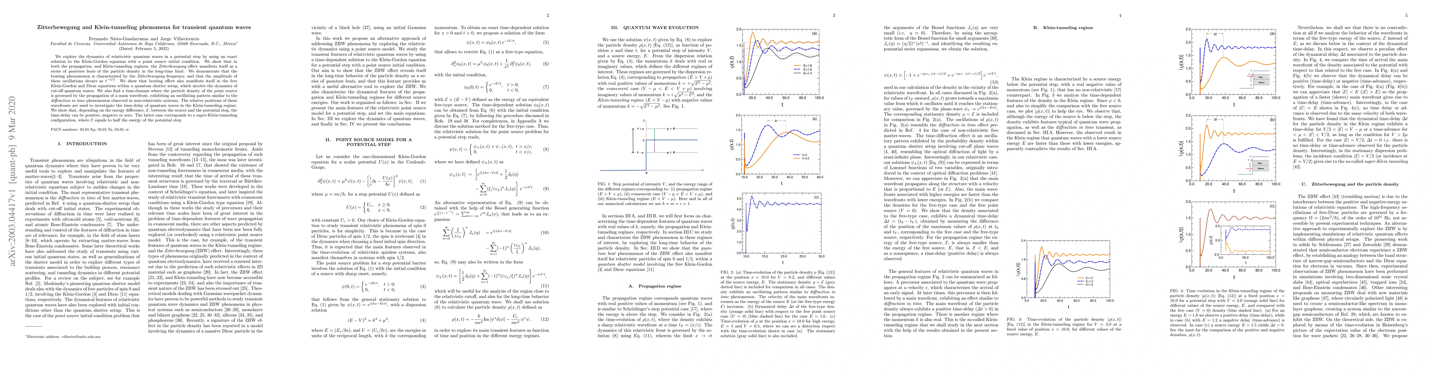 We explore the dynamics of relativistic quantum waves in a potential step by using an exact solution to the Klein-Gordon equation with a point source initial condition. We show that in both the propagation, and Klein-tunneling regimes, the Zitterbewegung effect manifests itself as a series of quantum beats of the particle density in the long-time limit. We demonstrate that the beating phenomenon is characterized by the Zitterbewegung frequency, and that the amplitude of these oscillations decays as $t^{-3/2}$. We show that beating effect also manifests itself in the free Klein-Gordon and Dirac equations within a quantum shutter setup, which involve the dynamics of cut-off quantum states. We also find a time-domain where the particle density of the point source is governed by the propagation of a main wavefront, exhibiting an oscillating pattern similar to the diffraction in time phenomenon observed in non-relativistic systems. The relative positions of these wavefronts are used to investigate the time-delay of quantum waves in the Klein-tunneling regime. We show that, depending on the energy difference, ${\cal E}$, between the source and the potential step, the time-delay can be positive, negative or zero. The latter case corresponds to a super-Klein-tunneling configuration, where ${\cal E}$ equals to half the energy of the potential step.