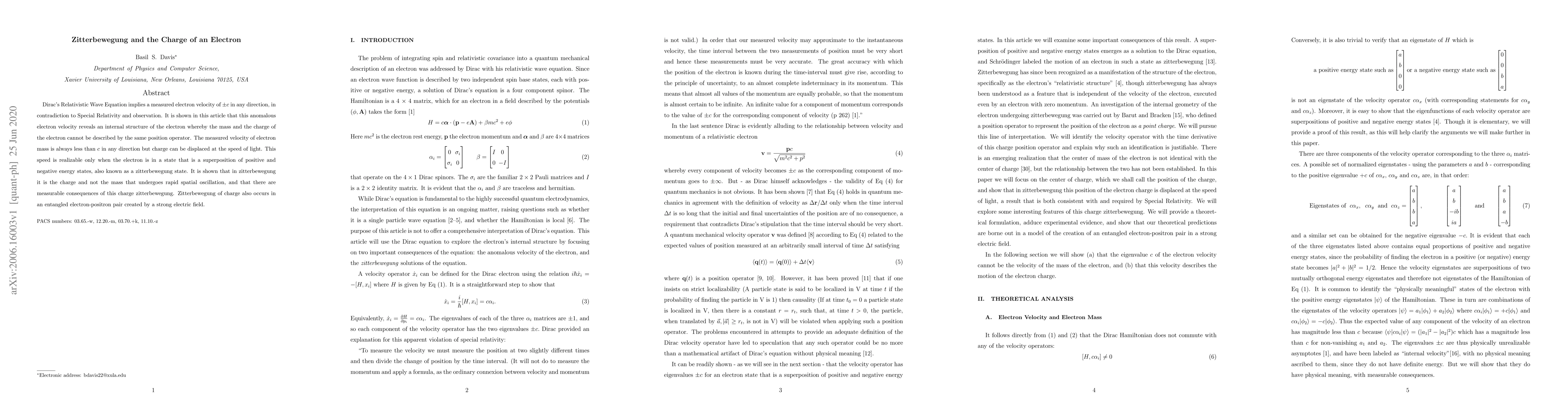 This paper argues that Dirac's equation leads to a contradiction regarding electron velocity, proposing that the electron's internal structure allows mass and charge to be described differently. It demonstrates that while the electron's mass moves slower than light, its charge can oscillate at light speed in a zitterbewegung state, revealing measurable consequences for both isolated and entangled electron-positron pairs.