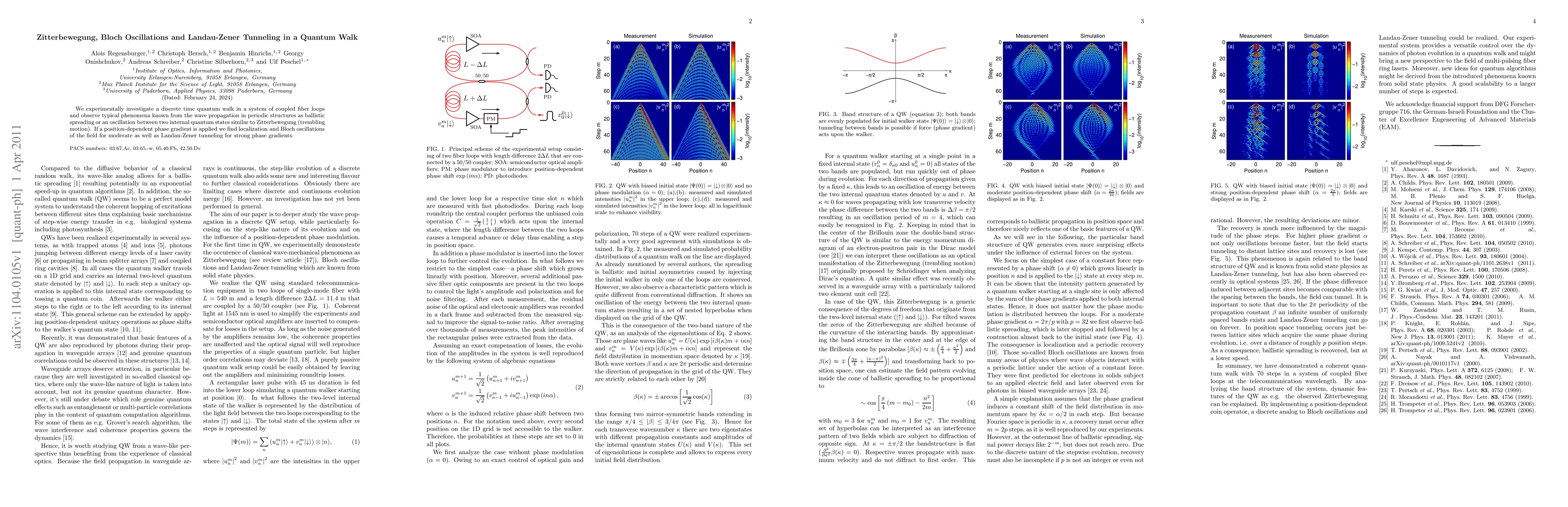 This paper experimentally investigates a quantum walk in coupled fiber loops, observing phenomena like Zitterbewegung, localization, Bloch oscillations, and Landau-Zener tunneling depending on the applied phase gradient. The study highlights the wave-like behavior in discrete time quantum walks.