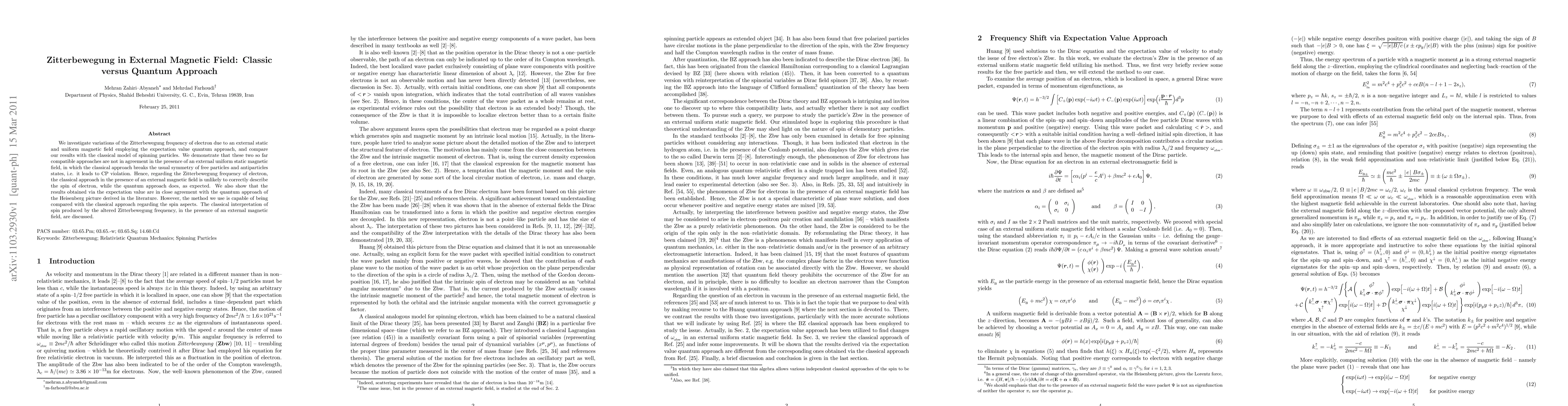 This paper compares the Zitterbewegung frequency of electrons in a static magnetic field using quantum and classical models, finding that the classical approach leads to CP violation and fails to describe electron spin accurately, while the quantum approach aligns well with established results. The study highlights discrepancies between classical and quantum interpretations of spin in magnetic fields.