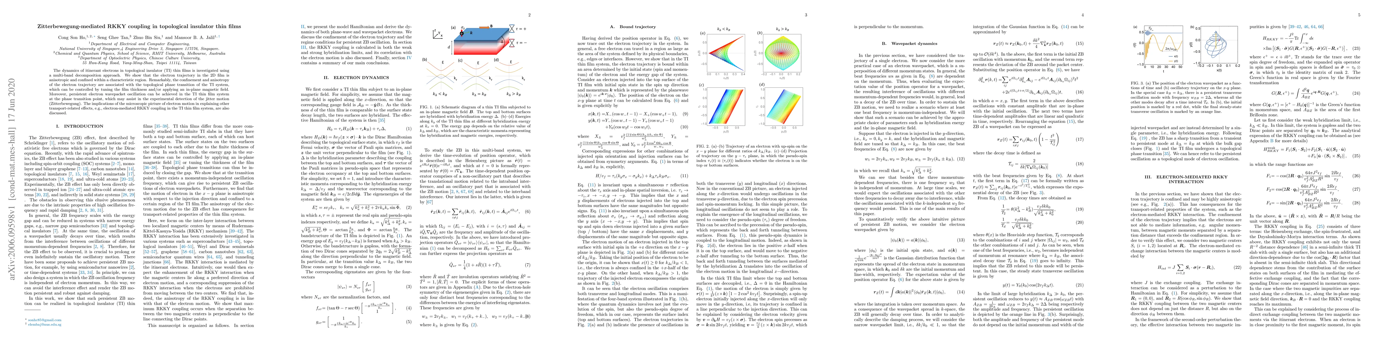 This research uses multi-band decomposition to analyze electron dynamics in topological insulator thin films, revealing anisotropic, thickness/field-tunable trajectories linked to topological phase transitions. It discusses the potential for detecting Zitterbewegung and implications for understanding electron-mediated RKKY coupling.