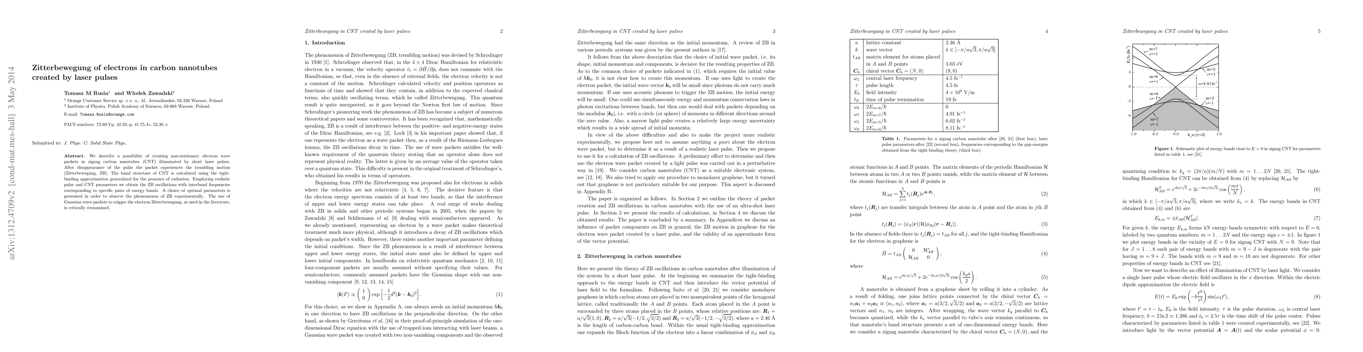 This paper explores the creation of non-stationary electron wave packets in zigzag carbon nanotubes using laser pulses, which induce Zitterbewegung oscillations after the pulse ceases. The study calculates the CNT band structure using a generalized tight-binding approximation and identifies optimal parameters for experimental observation of these oscillations.