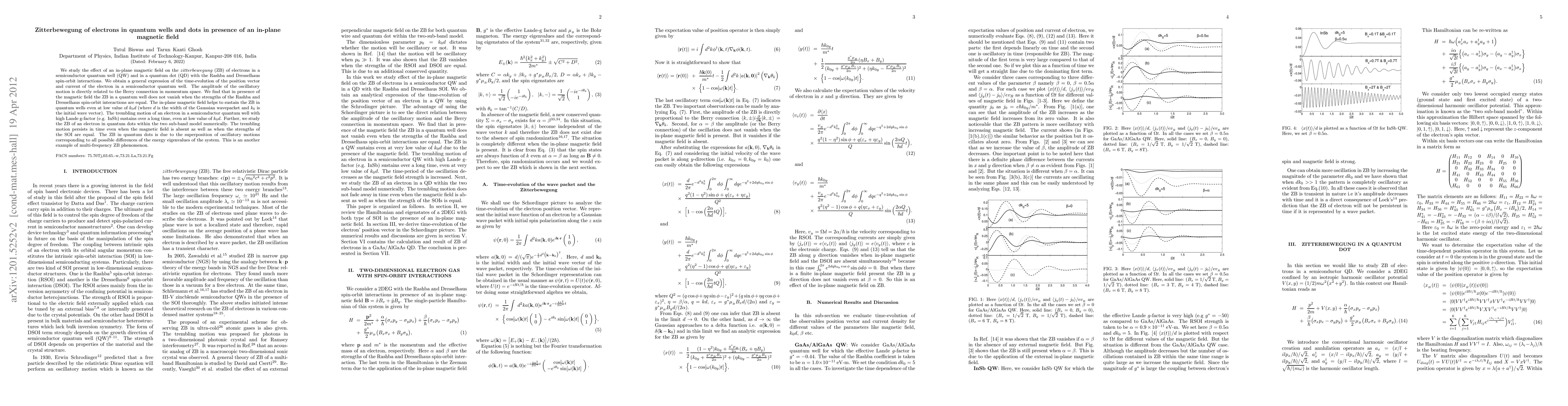 This paper investigates the zitterbewegung (ZB) of electrons in quantum wells and dots under an in-plane magnetic field, considering Rashba and Dresselhaus spin-orbit interactions. It finds that the ZB persists in quantum wells even when the spin-orbit interactions are equal, and is sustained by the magnetic field, especially in materials with high Lande g-factor. In quantum dots, ZB is a multi-frequency phenomenon due to energy eigenvalue differences.