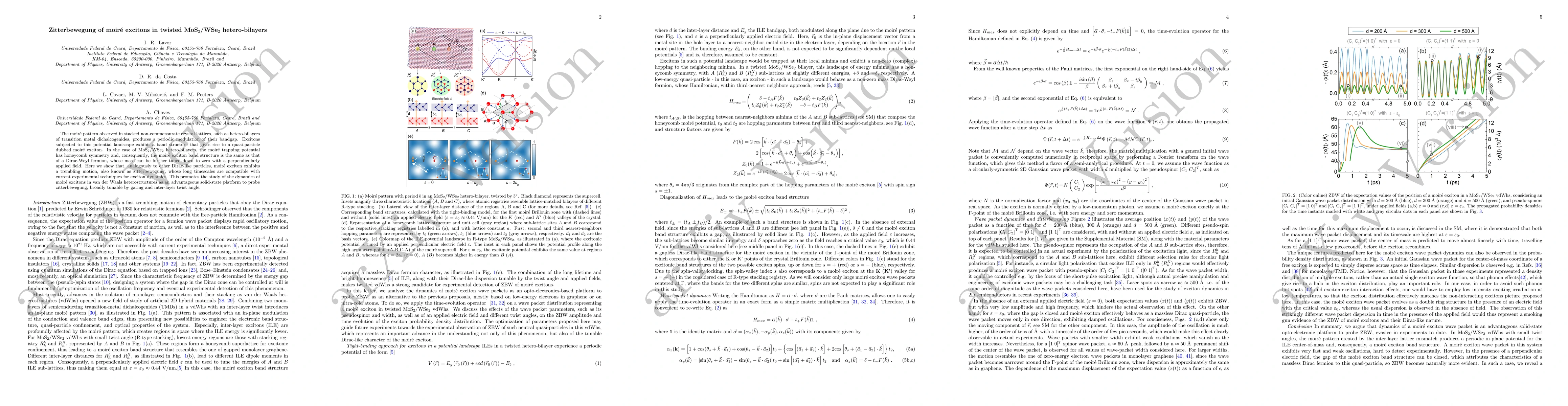 This paper investigates the zitterbewegung phenomenon in moiré excitons within twisted MoS$_2$/WSe$_2$ hetero-bilayers, demonstrating that these excitons exhibit a trembling motion analogous to Dirac-Weyl fermions, which can be experimentally probed in tunable van der Waals heterostructures.