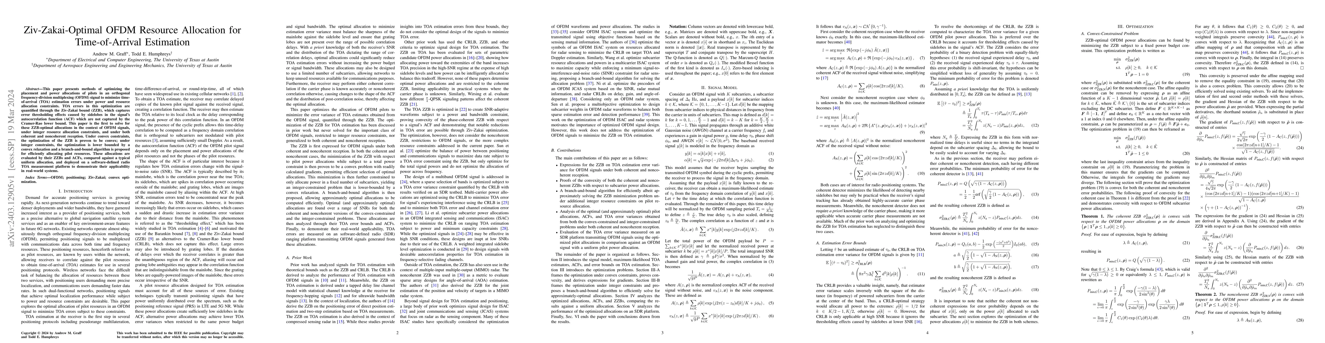 This paper optimizes pilot placement and power allocation in OFDM signals to minimize time-of-arrival estimation errors using the Ziv-Zakai bound, addressing power and resource constraints, and employing a branch-and-bound algorithm for integer resource allocation. The method is tested on a software-defined radio platform to validate real-world performance.