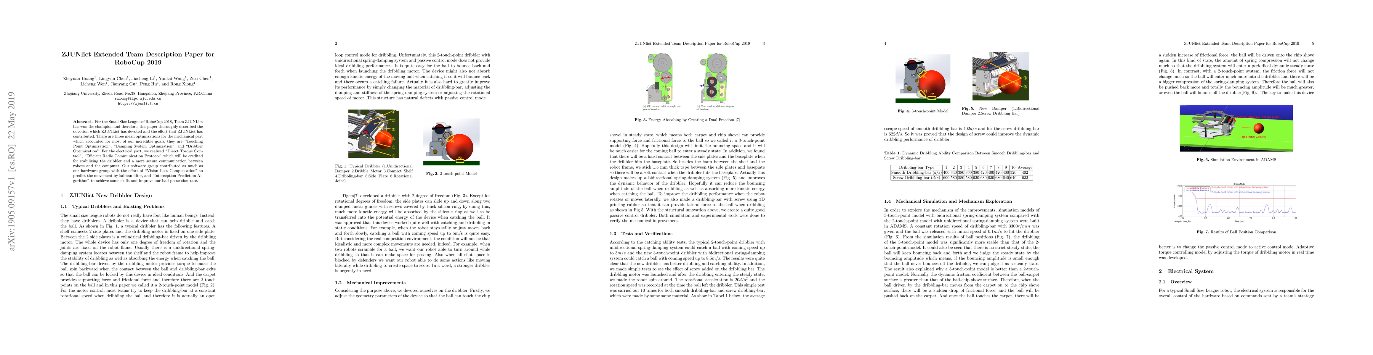 For the Small Size League of RoboCup 2018, Team ZJUNLict has won the champion and therefore, this paper thoroughly described the devotion which ZJUNLict has devoted and the effort that ZJUNLict has contributed. There are three mean optimizations for the mechanical part which accounted for most of our incredible goals, they are "Touching Point Optimization", "Damping System Optimization", and "Dribbler Optimization". For the electrical part, we realized "Direct Torque Control", "Efficient Radio Communication Protocol" which will be credited for stabilizing the dribbler and a more secure communication between robots and the computer. Our software group contributed as much as our hardware group with the effort of "Vision Lost Compensation" to predict the movement by kalman filter, and "Interception Prediction Algorithm" to achieve some skills and improve our ball possession rate.
