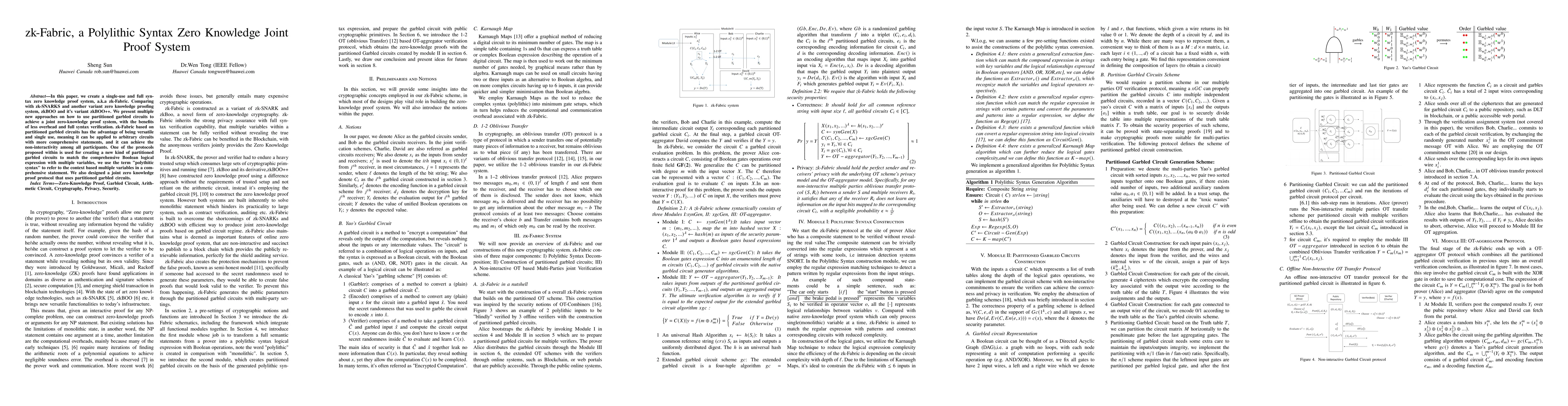 In this paper, we create a single-use and full syntax zero-knowledge proof system, a.k.a zk-Fabric. Comparing with zk-SNARKS and another variant zero-knowledge proofing system, zkBOO and it's variant zkBOO++. We present multiple new approaches on how to use partitioned garbled circuits to achieve a joint zero-knowledge proof system, with the benefits of less overhead and full syntax verification. zk-Fabric based on partitioned garbled circuits has the advantage of being versatile and single-use, meaning it can be applied to arbitrary circuits with more comprehensive statements, and it can achieve the non-interactivity among all participants. One of the protocols proposed within is used for creating a new kind of partitioned garbled circuits to match the comprehensive Boolean logical expression with multiple variables, we use the term "polythitic syntax" to refer to the context-based multiple variables in a comprehensive statement. We also designed a joint zero knowledge proof protocol that uses partitioned garbled circuits