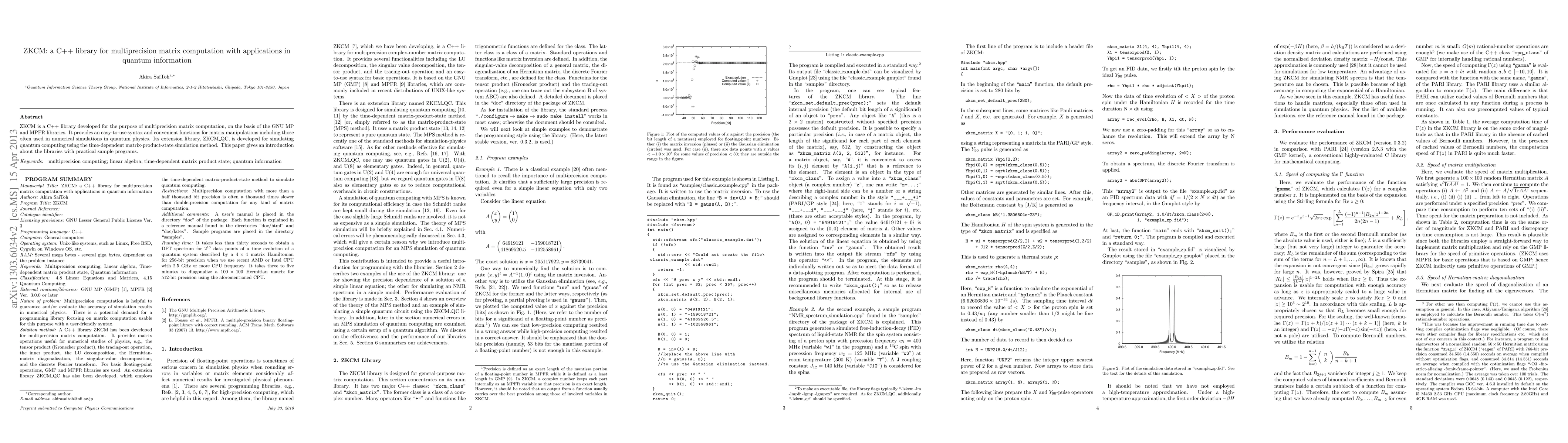 ZKCM is a C++ library for multiprecision matrix computations, leveraging GNU MP and MPFR, and includes functions for quantum physics simulations. Its extension, ZKCM_QC, simulates quantum computing via time-dependent matrix-product-state methods, with practical sample programs provided.