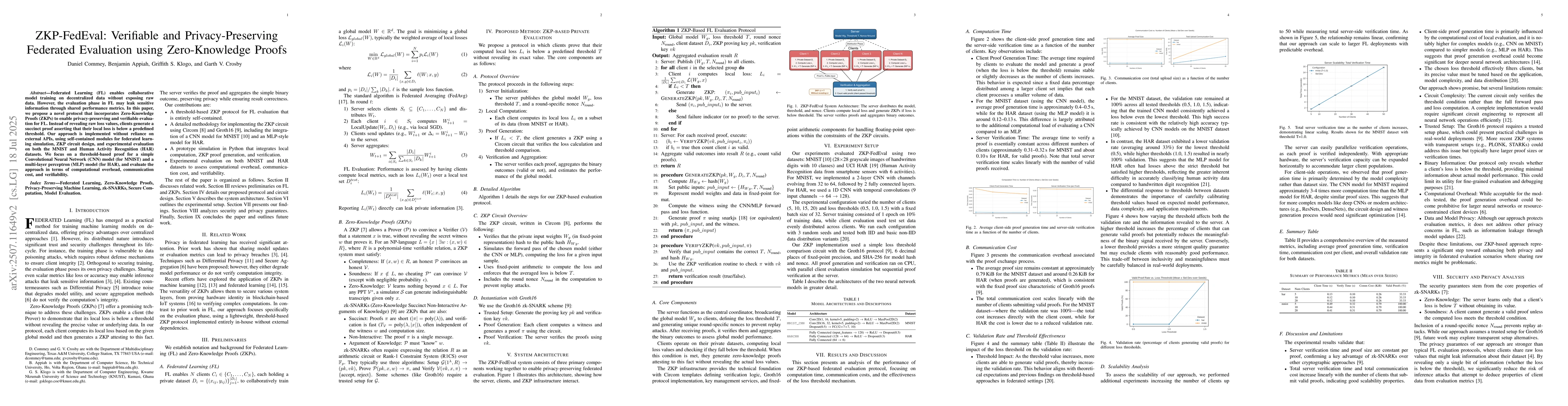 Federated Learning (FL) enables collaborative model training on decentralized data without exposing raw data. However, the evaluation phase in FL may leak sensitive information through shared performance metrics. In this paper, we propose a novel protocol that incorporates Zero-Knowledge Proofs (ZKPs) to enable privacy-preserving and verifiable evaluation for FL. Instead of revealing raw loss values, clients generate a succinct proof asserting that their local loss is below a predefined threshold. Our approach is implemented without reliance on external APIs, using self-contained modules for federated learning simulation, ZKP circuit design, and experimental evaluation on both the MNIST and Human Activity Recognition (HAR) datasets. We focus on a threshold-based proof for a simple Convolutional Neural Network (CNN) model (for MNIST) and a multi-layer perceptron (MLP) model (for HAR), and evaluate the approach in terms of computational overhead, communication cost, and verifiability.
