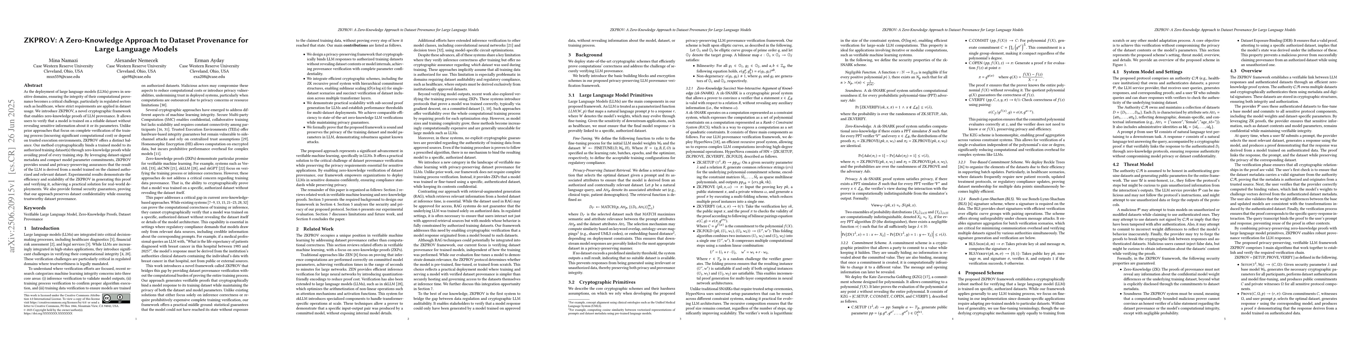The paper introduces ZKPROV, a cryptographic framework utilizing zero-knowledge proofs, commitments, signatures, and recursive folding mechanisms to establish dataset provenance for large language models without revealing sensitive information.