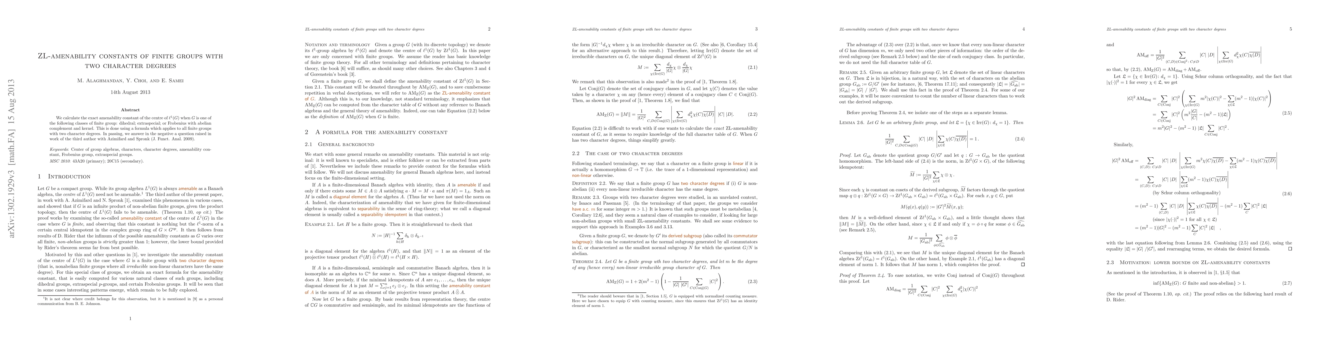 The paper calculates the exact amenability constant of the center of ℓ¹(G) for specific classes of finite groups: dihedral, extraspecial, and Frobenius with abelian complement and kernel, using a formula applicable to all finite groups with two character degrees.