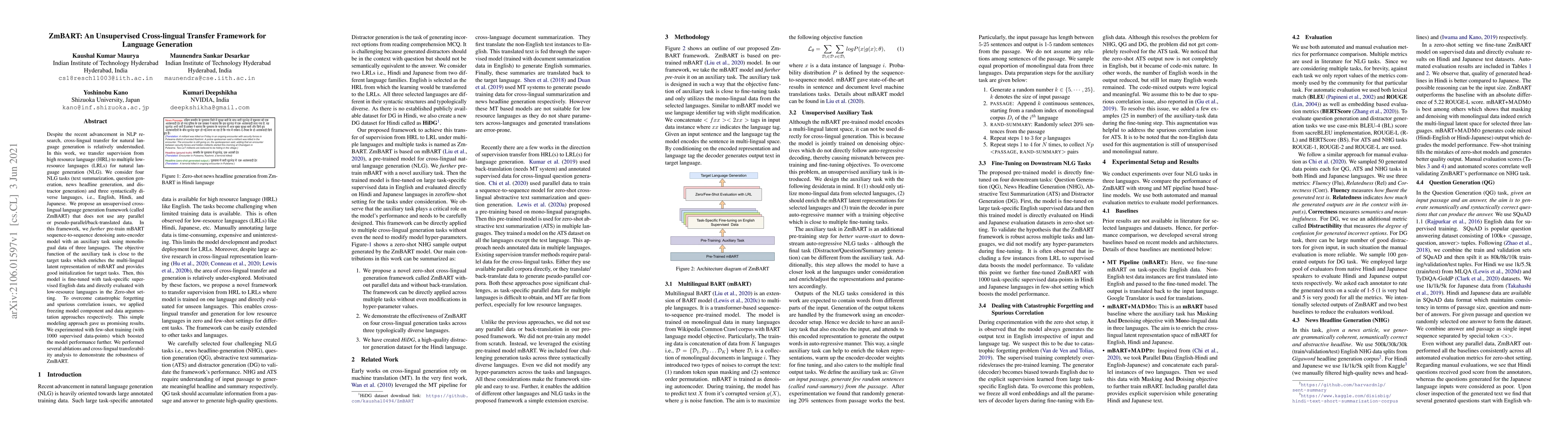 ZmBART is an unsupervised framework for cross-lingual transfer in natural language generation, transferring supervision from high-resource to low-resource languages without parallel data. It pre-trains mBART with an auxiliary task and fine-tunes it with English data, achieving promising results in text summarization, question generation, news headline, and distractor generation across English, Hindi, and Japanese.