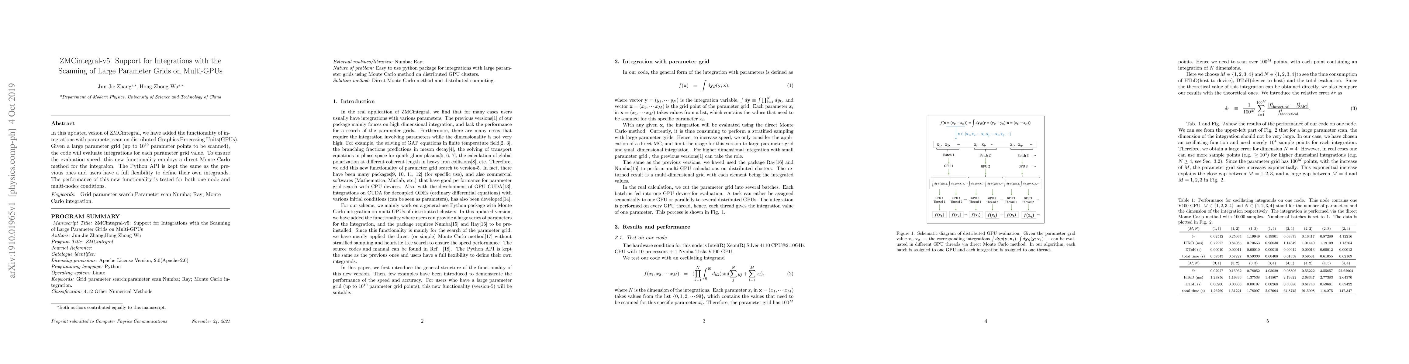 ZMCintegral-v5 now supports parameter scans across large grids using distributed Graphics Processing Units (GPUs). It employs a direct Monte Carlo method for efficient integration evaluation, maintaining the same Python API for user-defined integrands, and has been tested for performance on both single and multi-node setups.