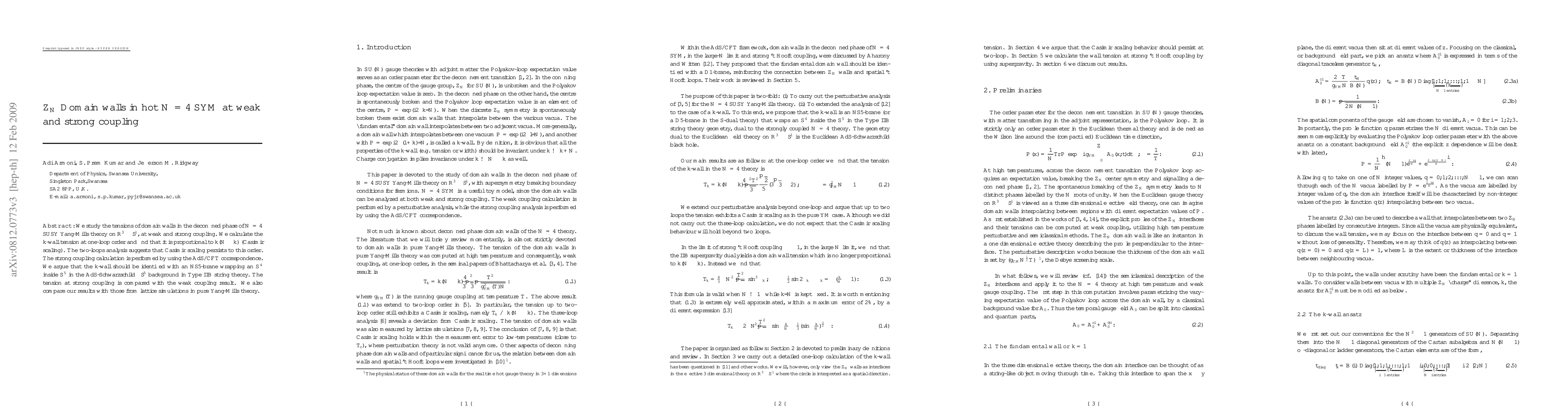 This paper investigates the tensions of domain walls in N=4 supersymmetric Yang-Mills theory at both weak and strong coupling, finding Casimir scaling in the one-loop tension calculation. The strong coupling analysis employs the AdS/CFT correspondence, identifying the k-wall with an NS5-brane in string theory, and compares results with lattice simulations.