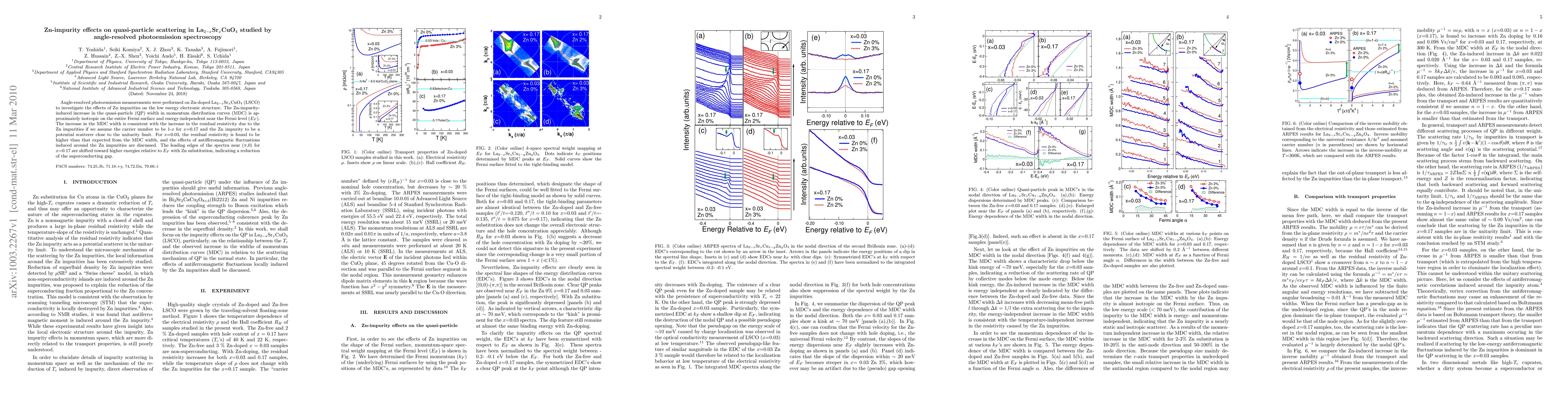 This study uses angle-resolved photoemission spectroscopy to explore how Zn impurities affect quasi-particle scattering in Zn-doped La2-xSrxCuO4, finding an isotropic, energy-independent increase in quasi-particle width near the Fermi level, linked to residual resistivity, and a reduction in the superconducting gap with Zn substitution.