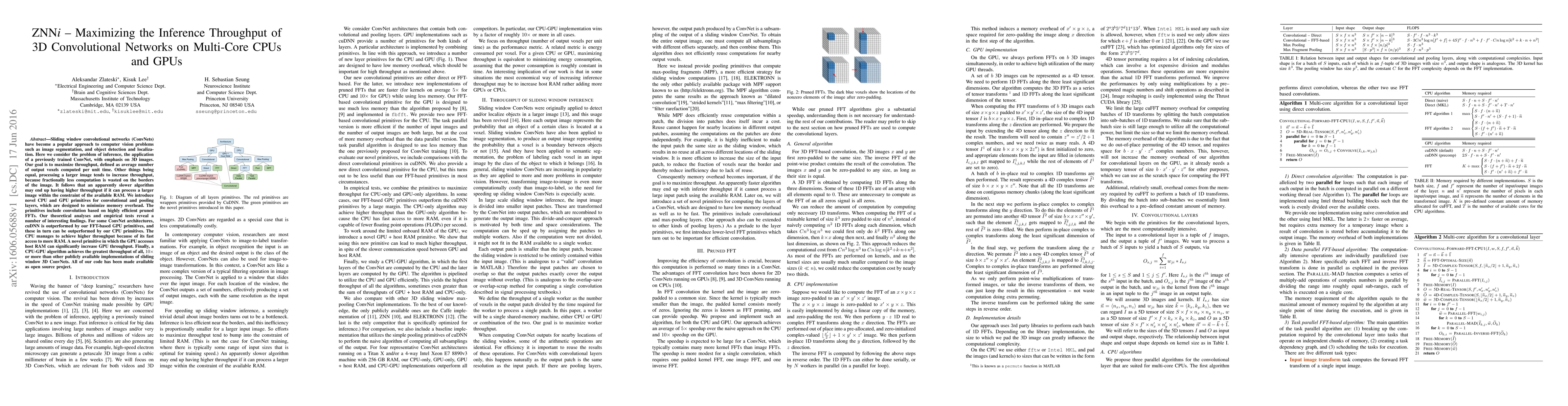 Sliding window convolutional networks (ConvNets) have become a popular approach to computer vision problems such as image segmentation, and object detection and localization. Here we consider the problem of inference, the application of a previously trained ConvNet, with emphasis on 3D images. Our goal is to maximize throughput, defined as average number of output voxels computed per unit time. Other things being equal, processing a larger image tends to increase throughput, because fractionally less computation is wasted on the borders of the image. It follows that an apparently slower algorithm may end up having higher throughput if it can process a larger image within the constraint of the available RAM. We introduce novel CPU and GPU primitives for convolutional and pooling layers, which are designed to minimize memory overhead. The primitives include convolution based on highly efficient pruned FFTs. Our theoretical analyses and empirical tests reveal a number of interesting findings. For some ConvNet architectures, cuDNN is outperformed by our FFT-based GPU primitives, and these in turn can be outperformed by our CPU primitives. The CPU manages to achieve higher throughput because of its fast access to more RAM. A novel primitive in which the GPU accesses host RAM can significantly increase GPU throughput. Finally, a CPU-GPU algorithm achieves the greatest throughput of all, 10x or more than other publicly available implementations of sliding window 3D ConvNets. All of our code has been made available as open source project.