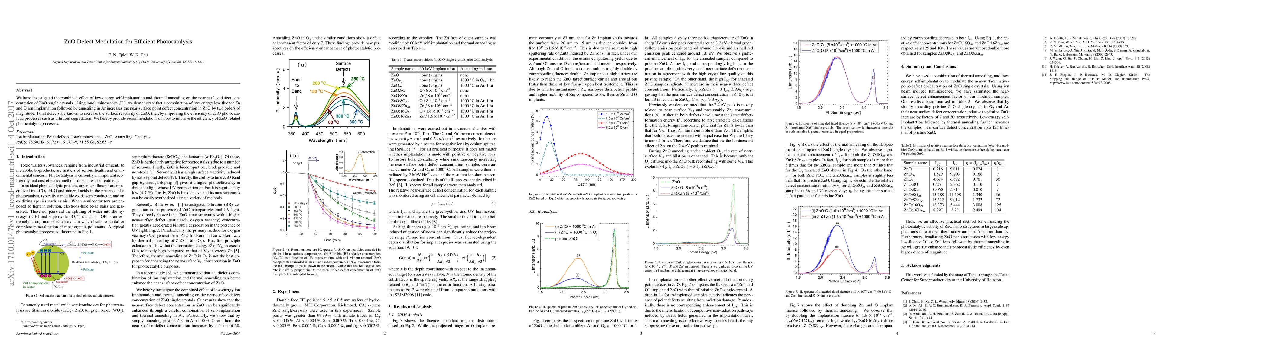 This study explores how low-energy Zn and O ion implantation followed by Ar annealing can significantly increase near-surface defect concentration in ZnO, enhancing its photocatalytic efficiency for processes like bilirubin degradation. The findings offer practical guidelines for optimizing ZnO-based photocatalysis.